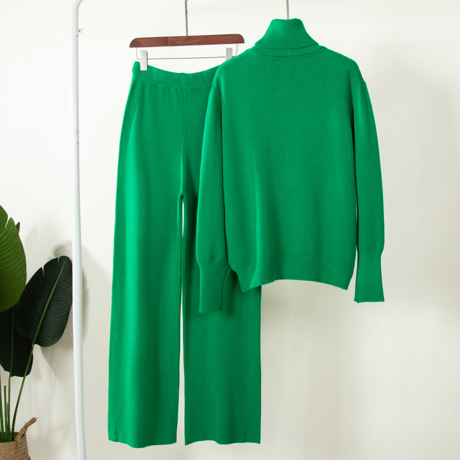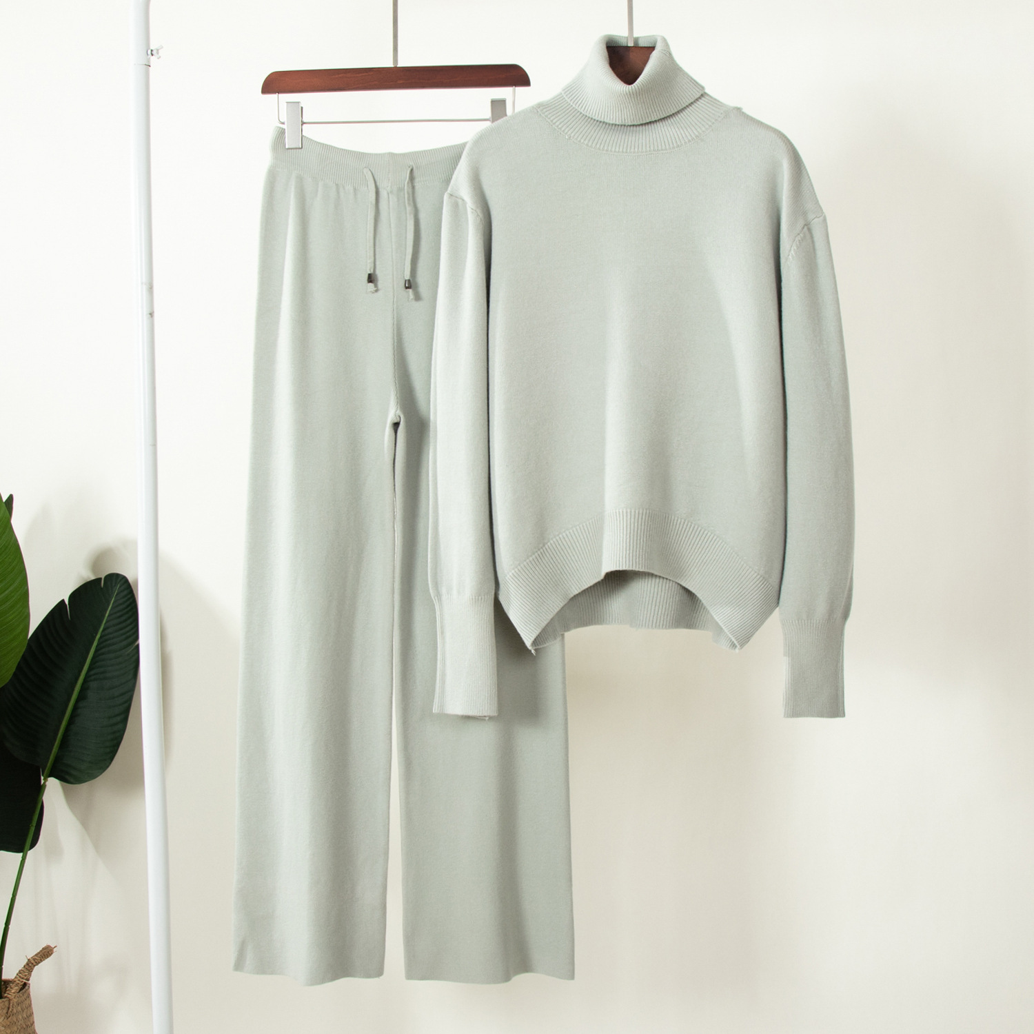 Cross-border solid color turtleneck sweater + wide-leg pants knitted two-piece set, European and American winter versatile loose sweater set suits