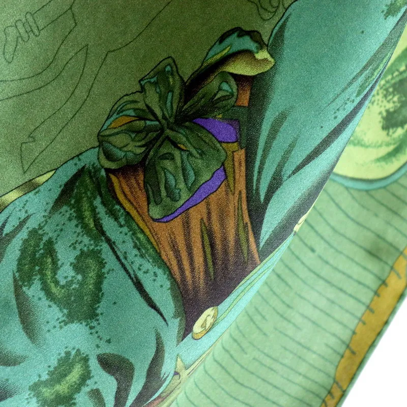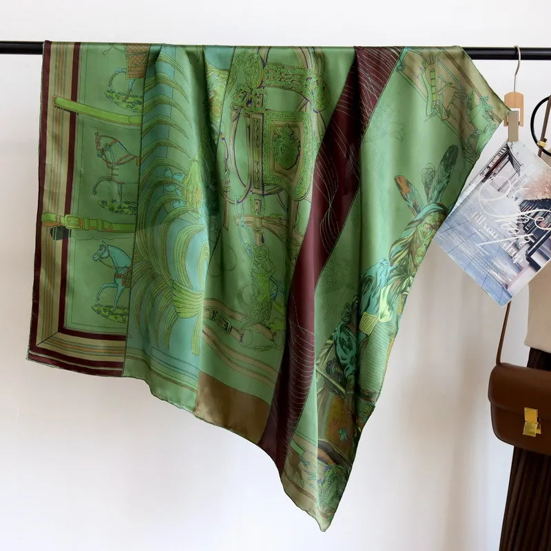 High-end Elegant Women Fine Olive Green Saddle Splicing Print Quality Plain Satin Silk Hand-rolled Edge Large Square Scarf Shawl