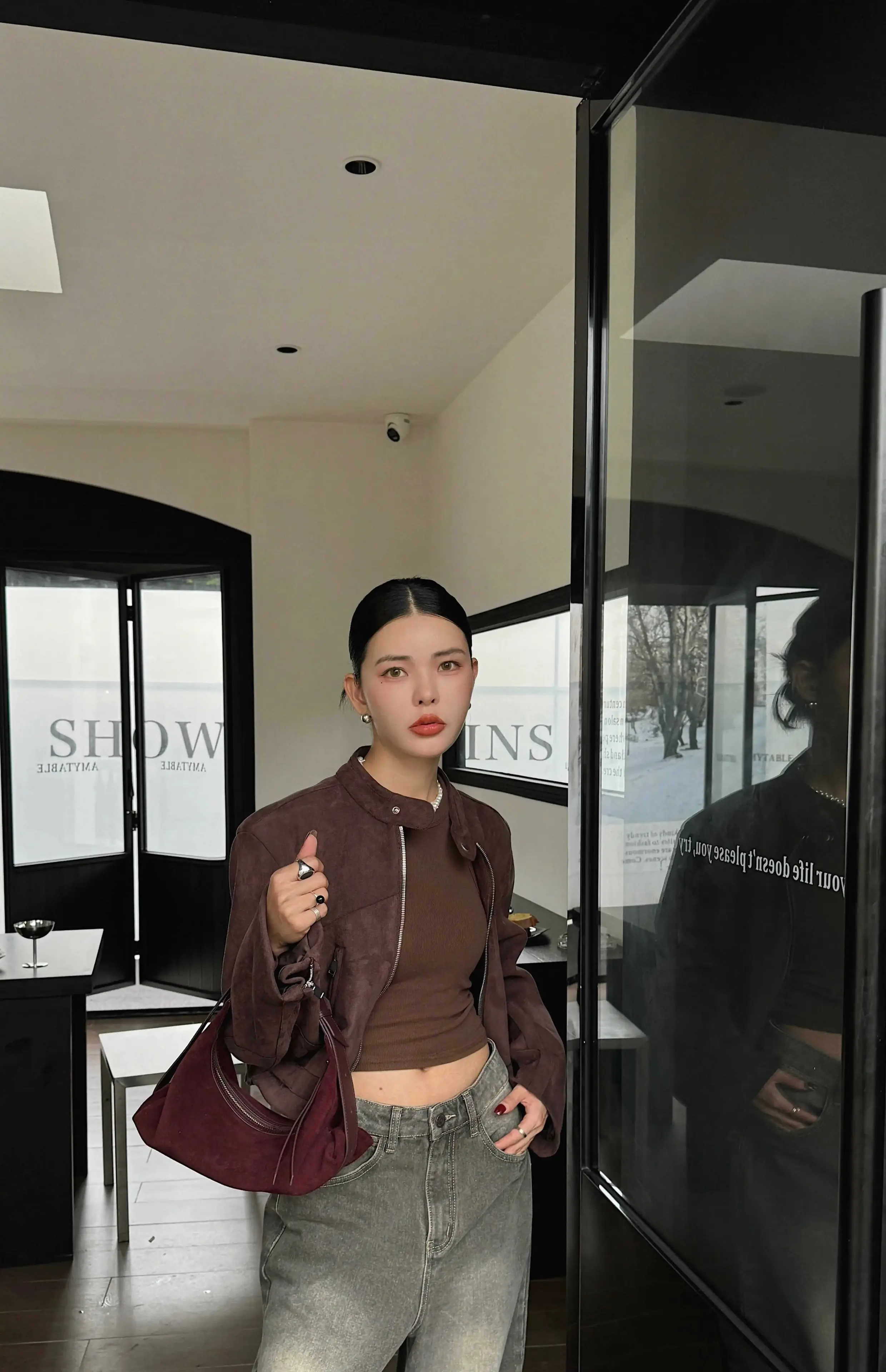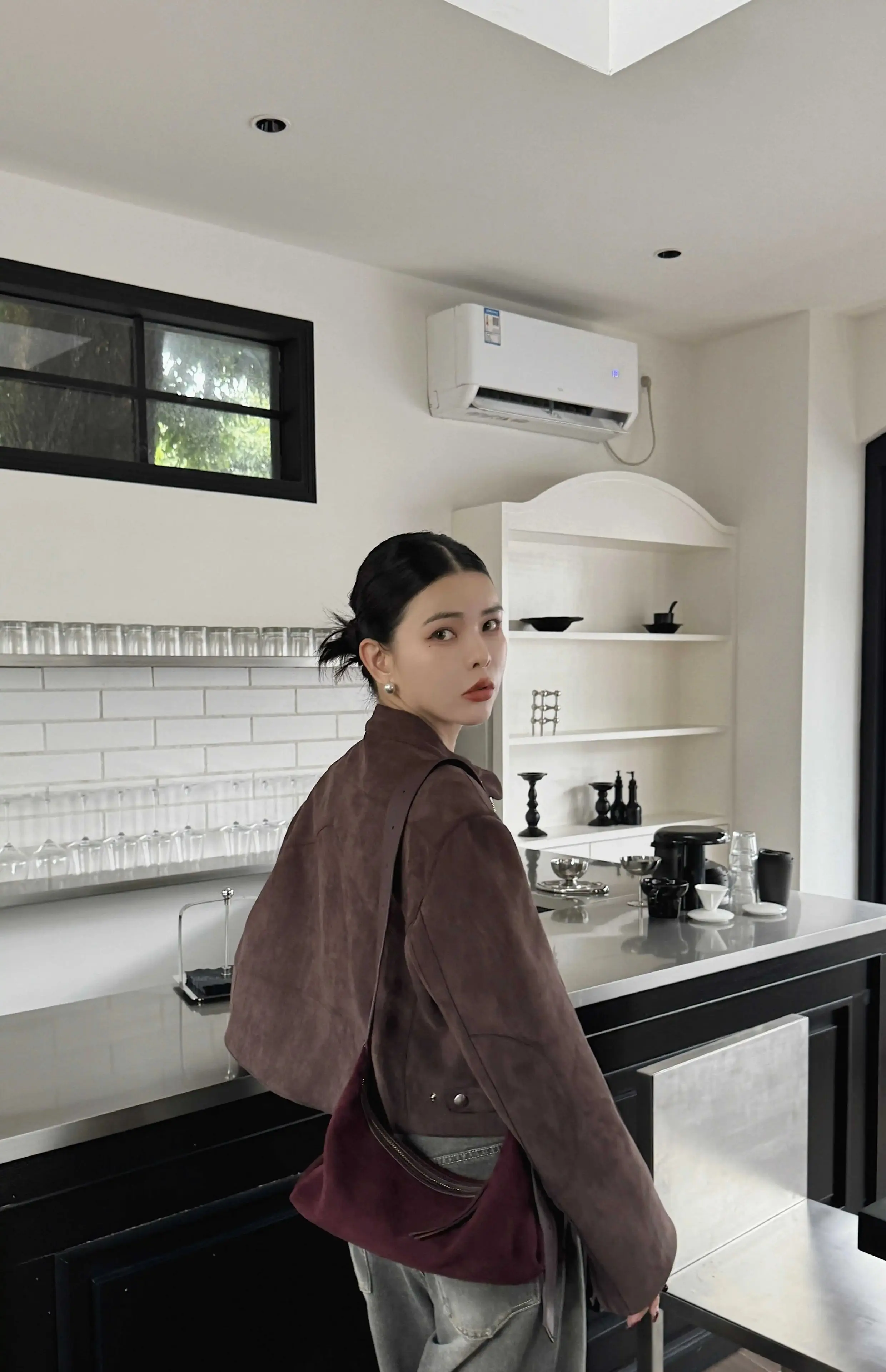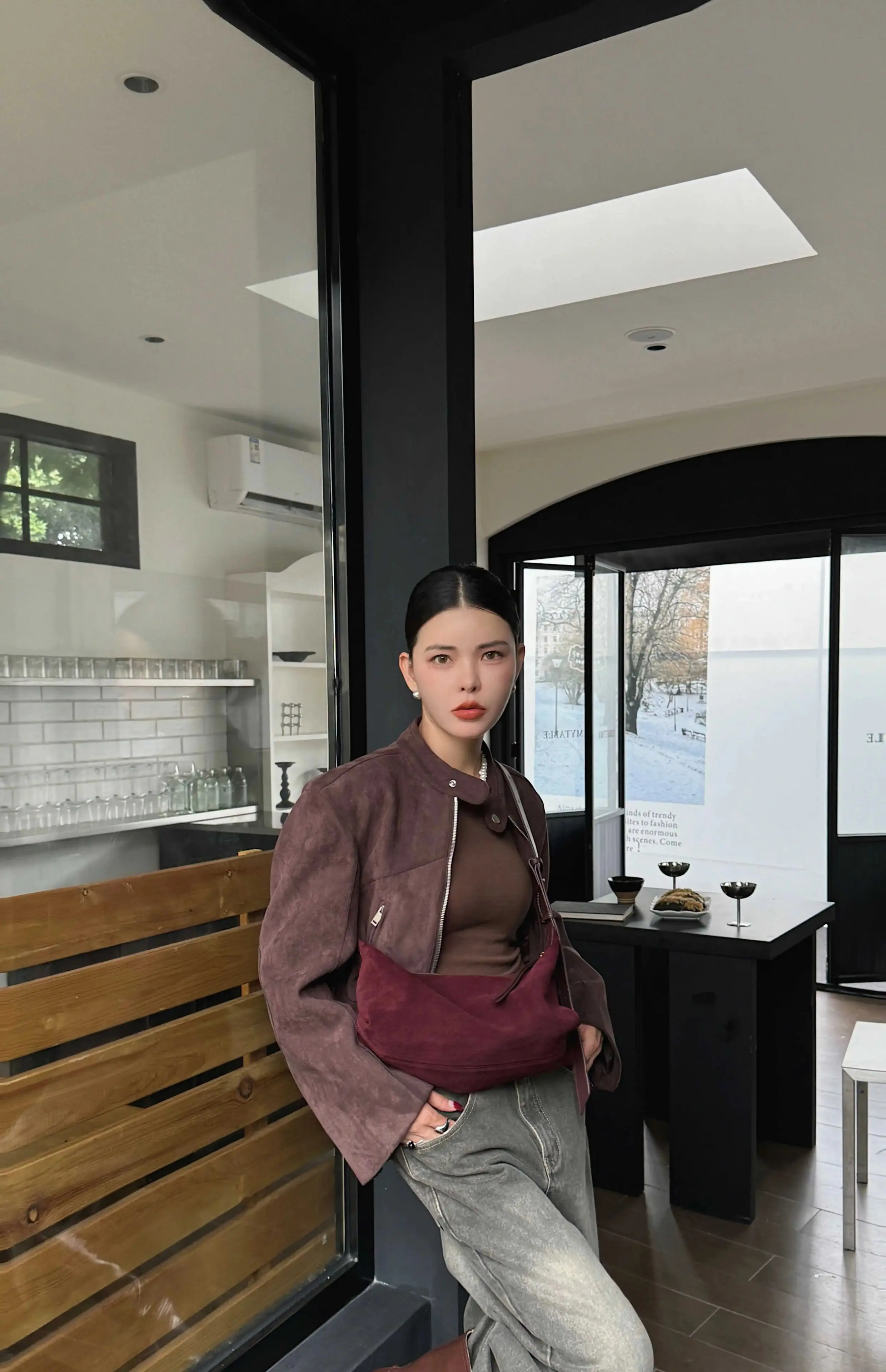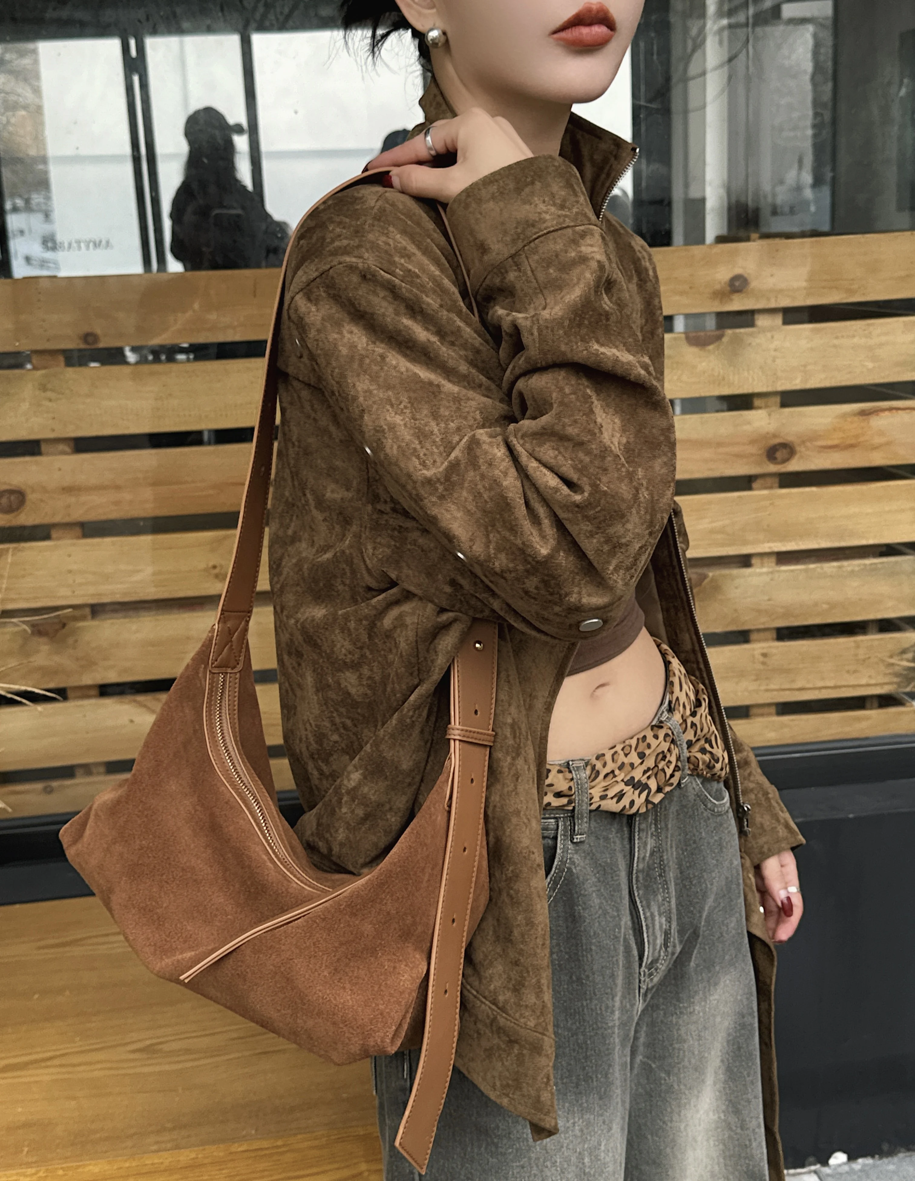 Hot Sale Maillard Coffee Color Triangle Tote Unique Design Thick Suede Cow Leather Women Handbag High Quality Lady Shoulder Bag