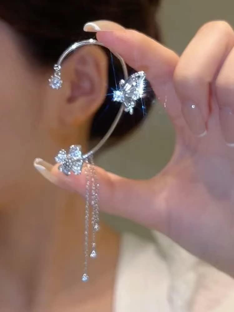 Rhinestone Butterfly Ear Cuffs Tassel Chain Dangle Earrings