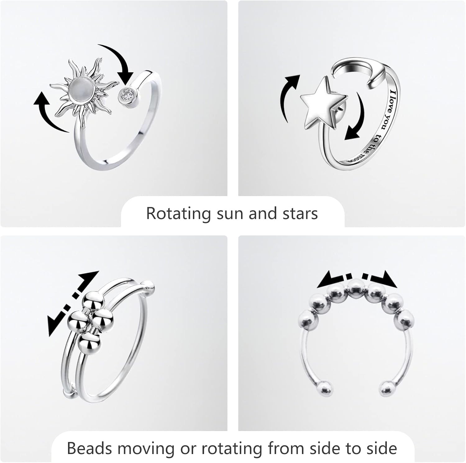 ATCEME 4PCS Fidget Rings for Women Adjustable Stress Relief Fidget Spinner Ring Stainless Steel Sun Moon Star Bead Rotatable Fidget Rings (Silver)