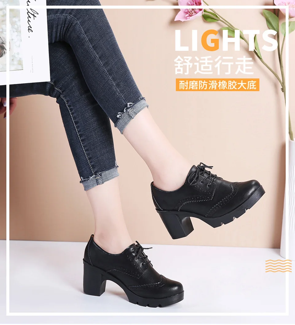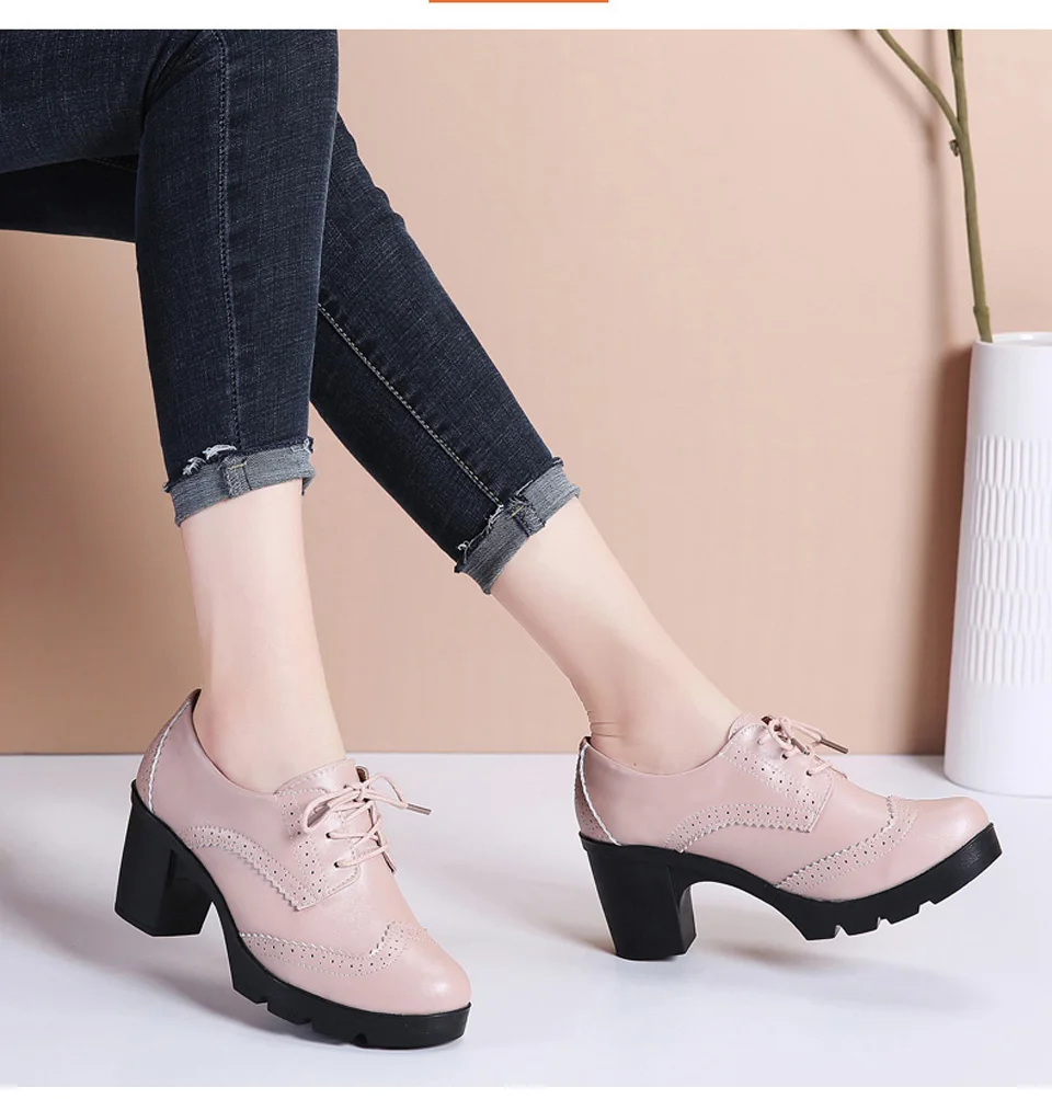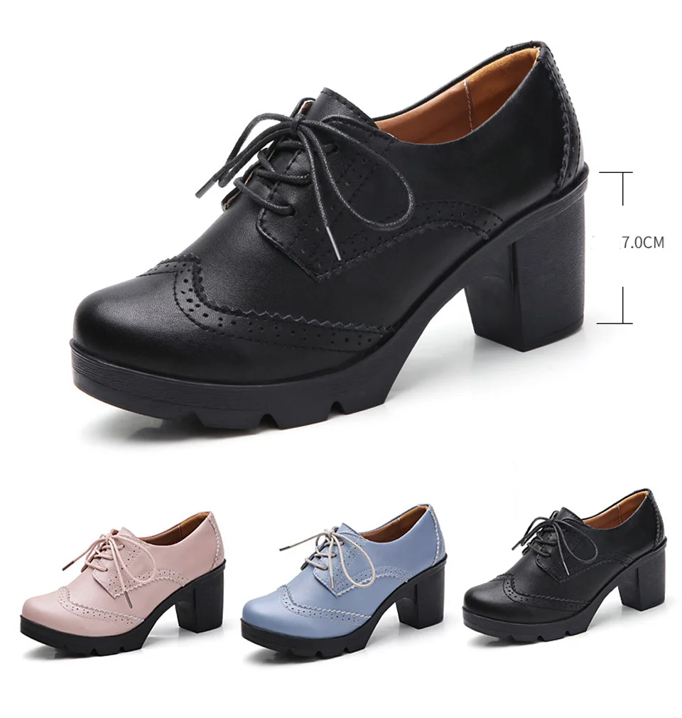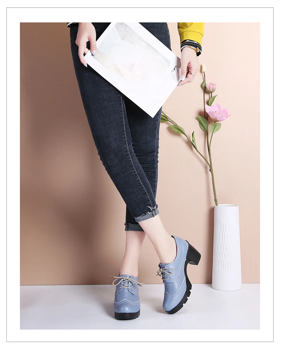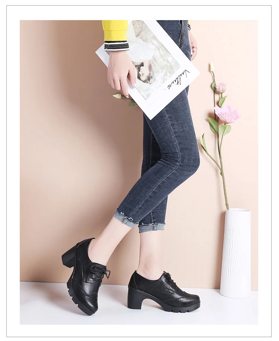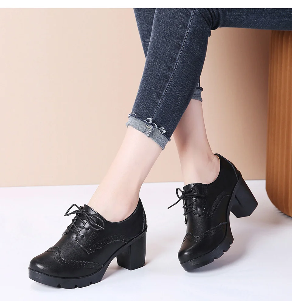 Manufacturer EOFK Women Brogue Shoes New Quaity High Square Heel Derby Genuine Leather High Heels Wedge Shoes Woman Female Shoes Pumps Casual Pumps