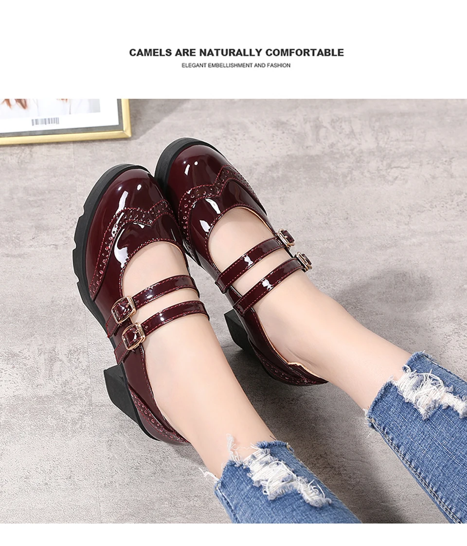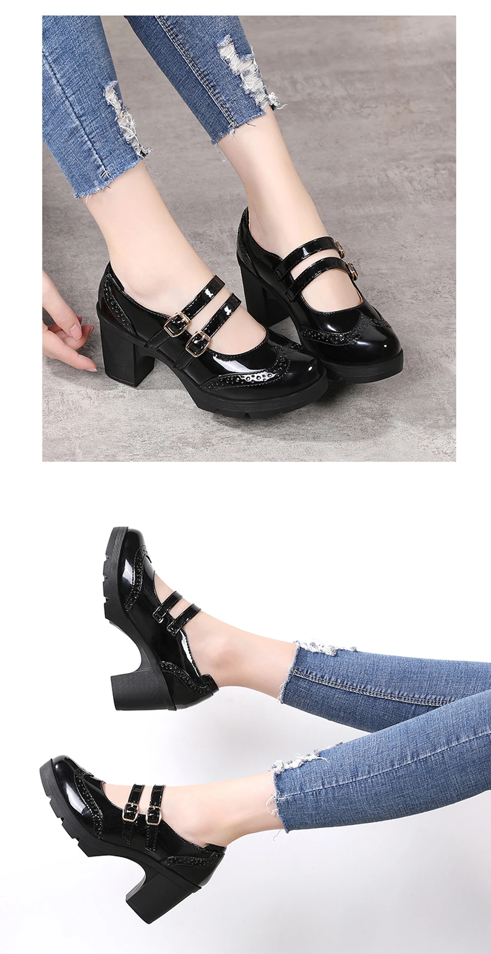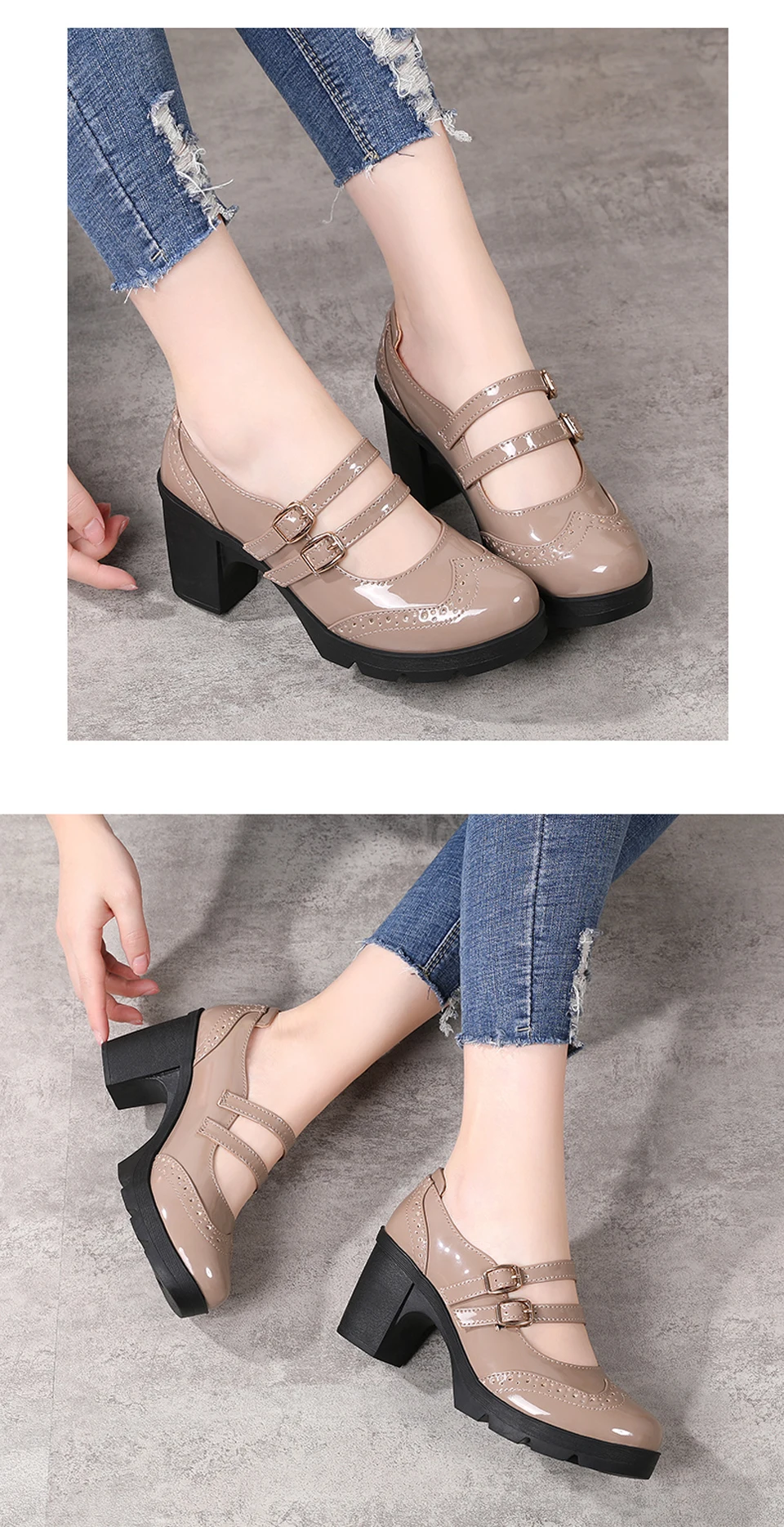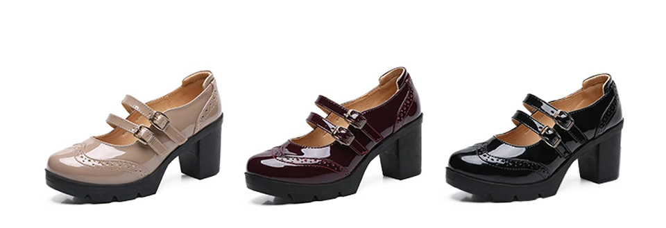 Manufacturer EOFK Women Pumps Shoes Genuine Leather New Mary Jane High Heels Shinny Patent Woman Ladies Shoes Pumps Brogue High Square Heel Pumps