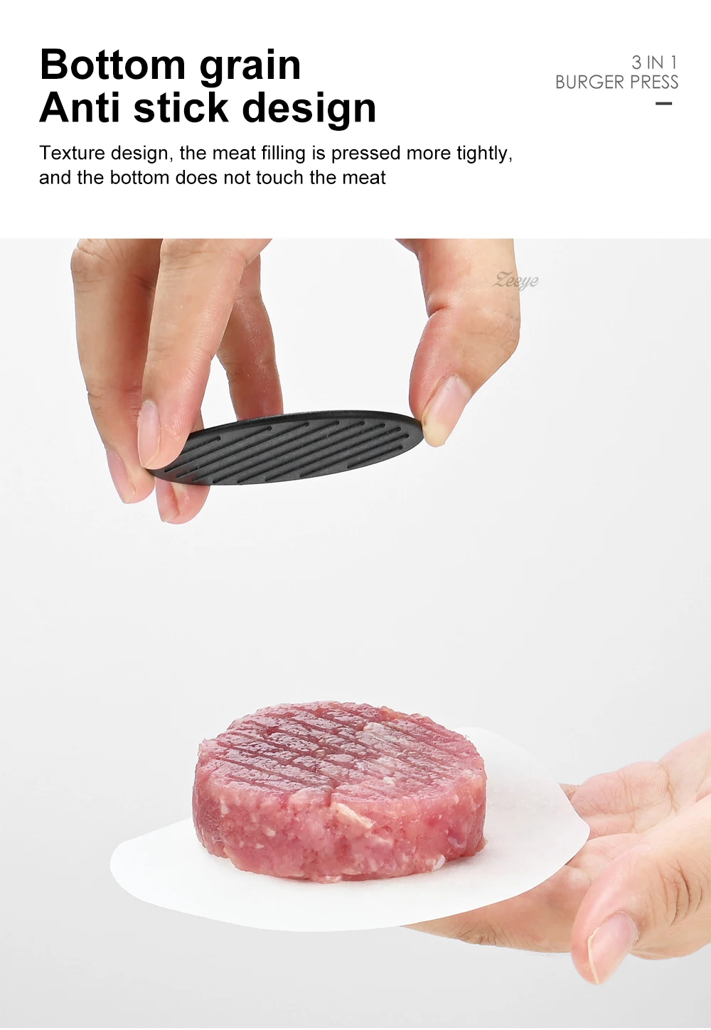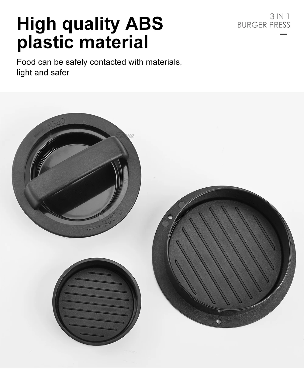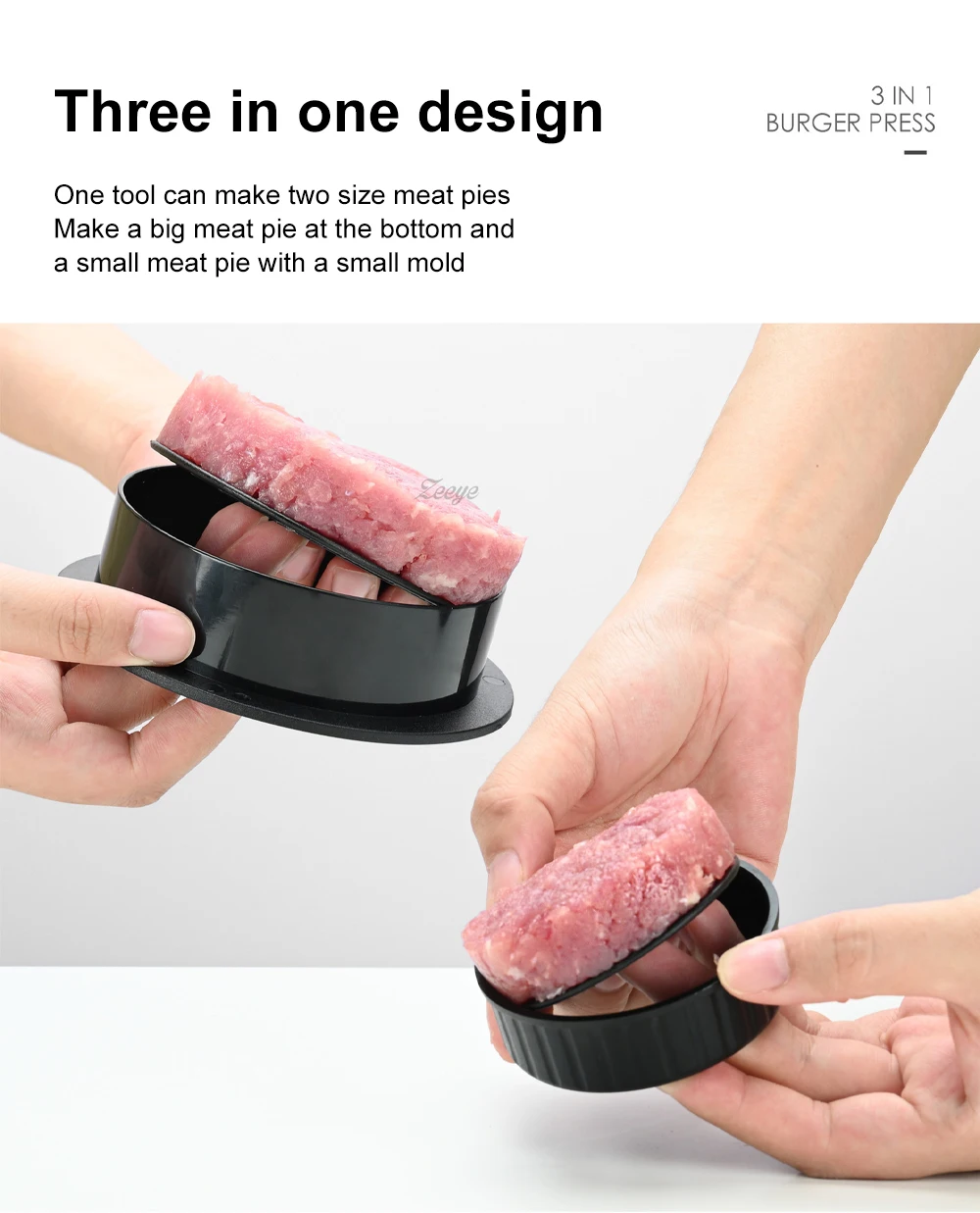 1. 3 in 1 Hamburg maker, a professional design gadget, has 3 different functions. The main three functions of the separate filling Hamburger Press are the extra Mini Burger mold, innovative design, the best filling burger and the removable bottom, keeping the pie in the same shape as you form.