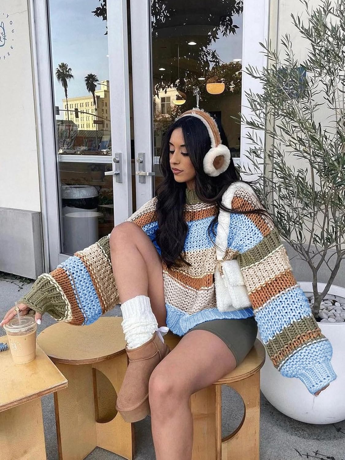 Manufacturer Saodimallsu Womens Color Block Sweater Striped Chunky Knit Cropped Sweaters Crewneck Fall Long Sleeve Loose Pullover Tops sweaters