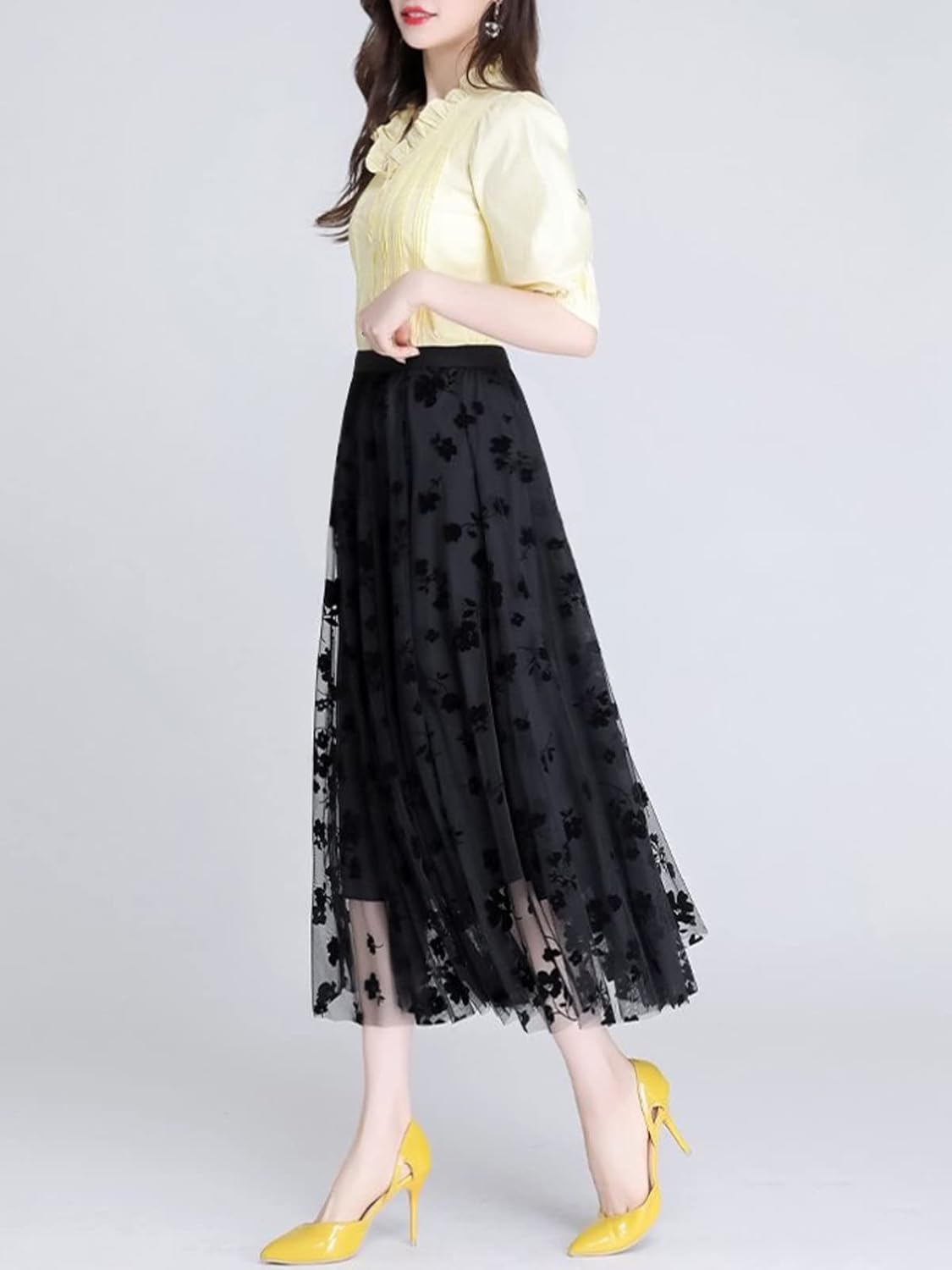 Skirts for Women Midi Long Length Dressy Casual Trendy Summer Tulle A-Line Floral High Waist Skirt