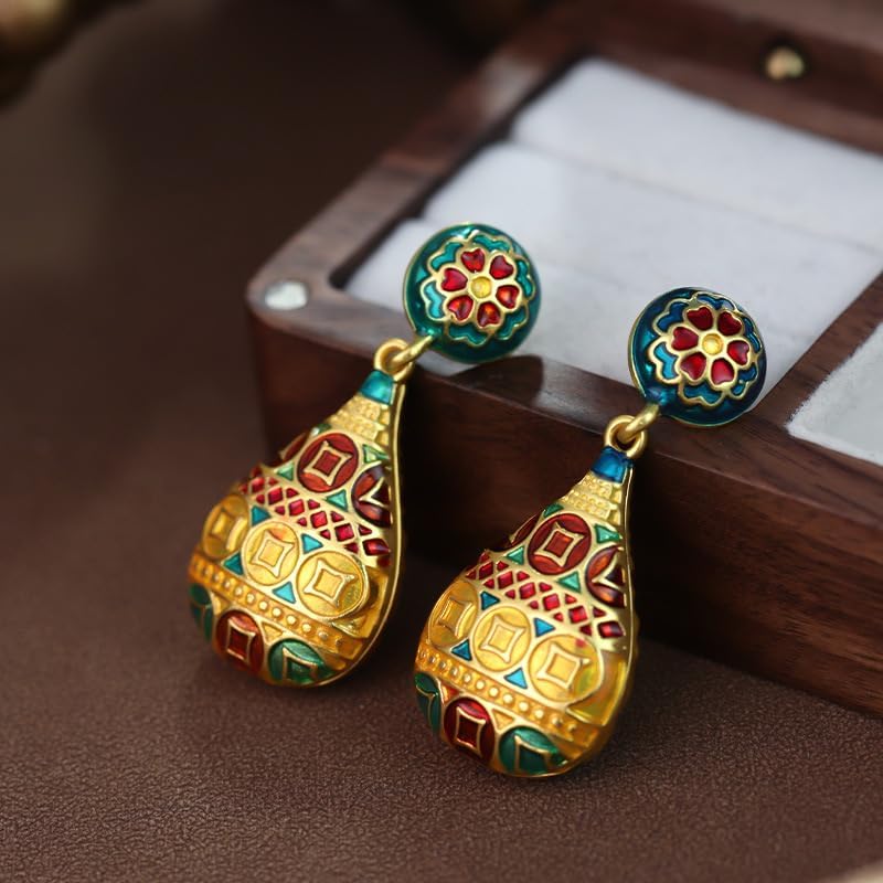 Embrace the timeless elegance of Chinese culture with these exquisite drop earrings for women. Meticulously hand-painted with a vibrant floral design, these earrings feature a captivating blend of turquoise, blue, and gold hues. The intricate patterns and rich colors evoke the beauty of traditional Chinese art, while the gold accents add a touch of vintage charm. Crafted with care, these lightweight earrings measure approximately 2.5 inches (6.35 cm) in length, making them a statement piece that effortlessly elevates any outfit. Whether you're attending a formal event or simply seeking to add a touch of sophistication to your everyday look, these Chinese-inspired drop earrings are sure to turn heads and leave a lasting impression. Embrace the timeless allure of Eastern aesthetics with these stunning earrings that seamlessly blend cultural heritage with modern fashion.