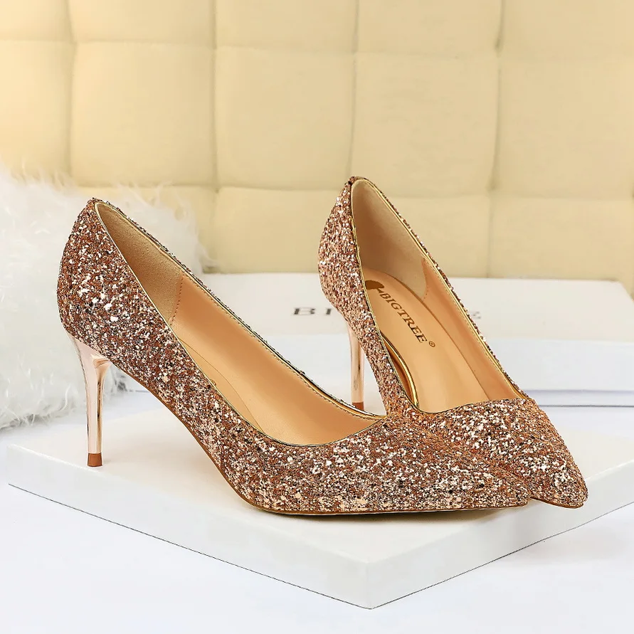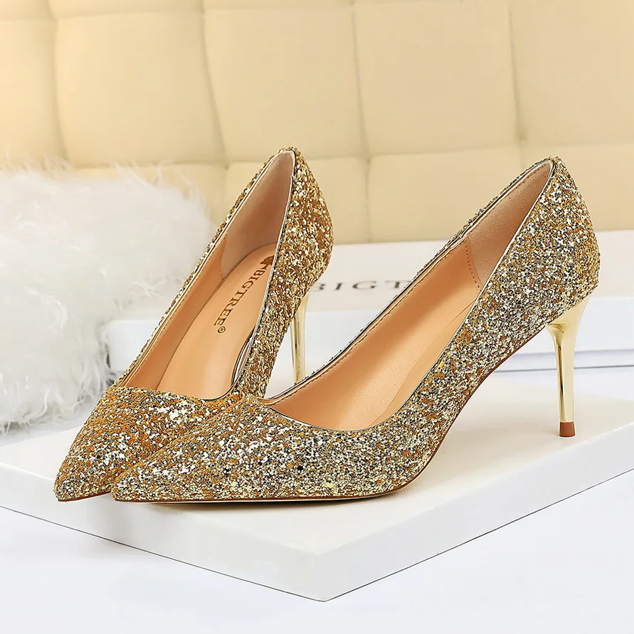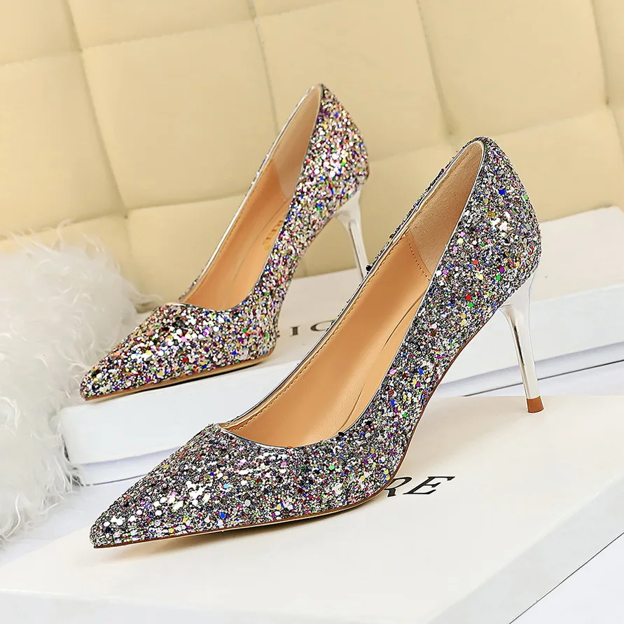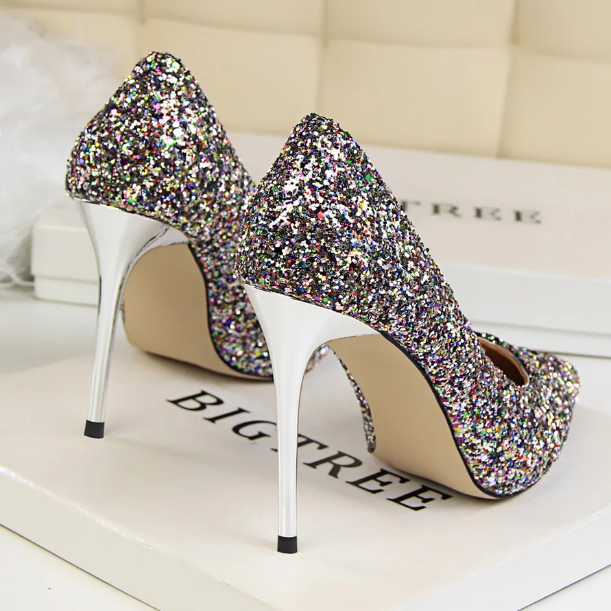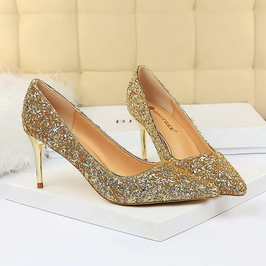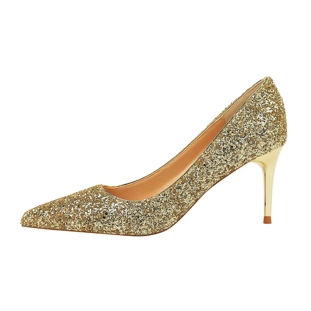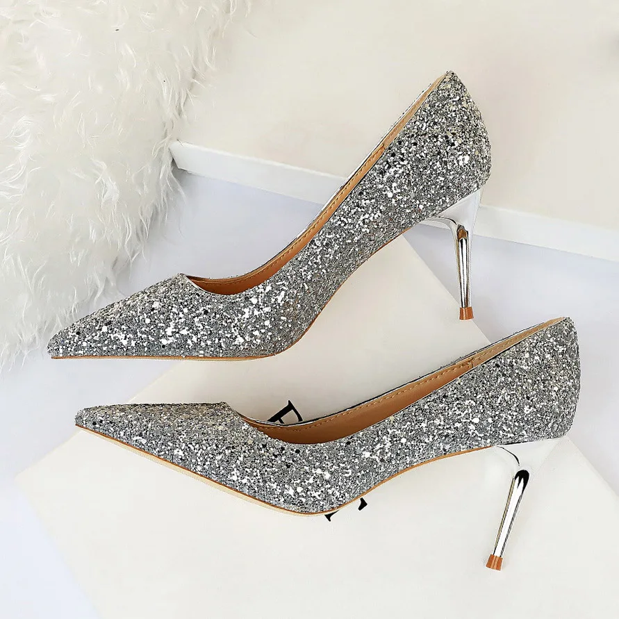 Manufacturer Women 7cm 9.5cm High Heels Pumps Wedding Bridal Scarpins Sparkly Mid Heels Lady Party Sequins Glitter Evening Gold Silver Shoes Pumps