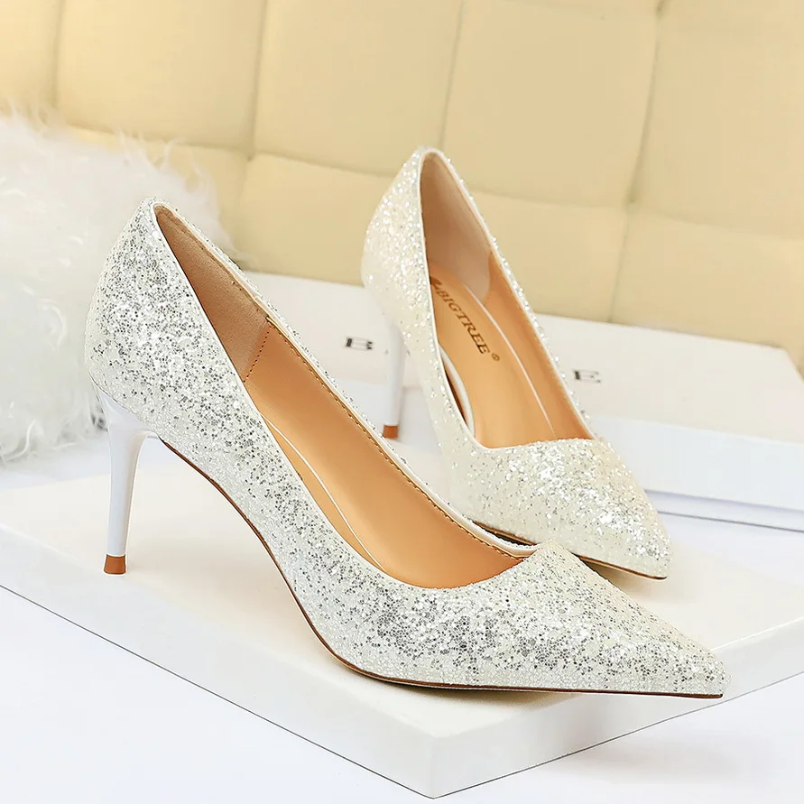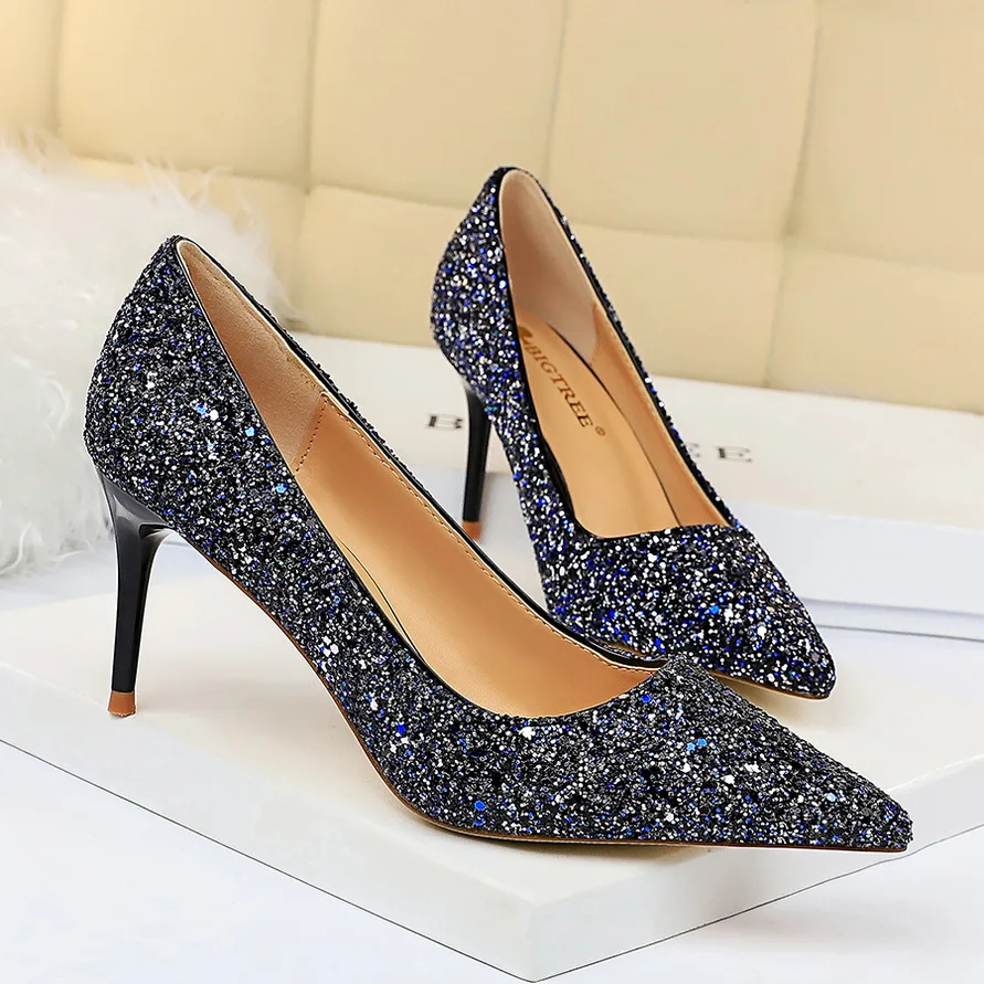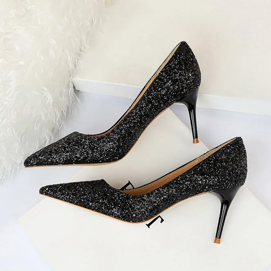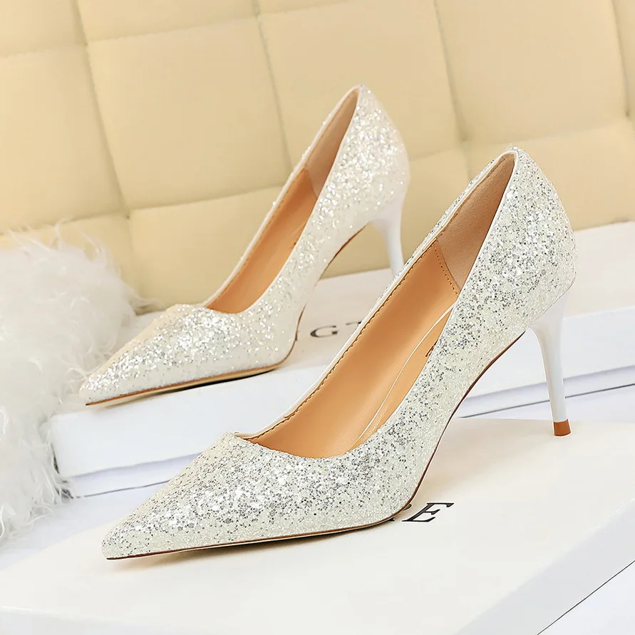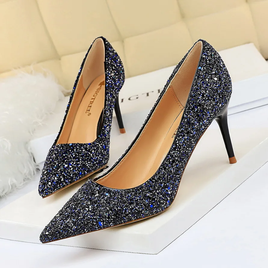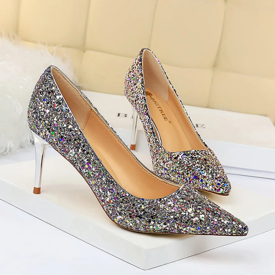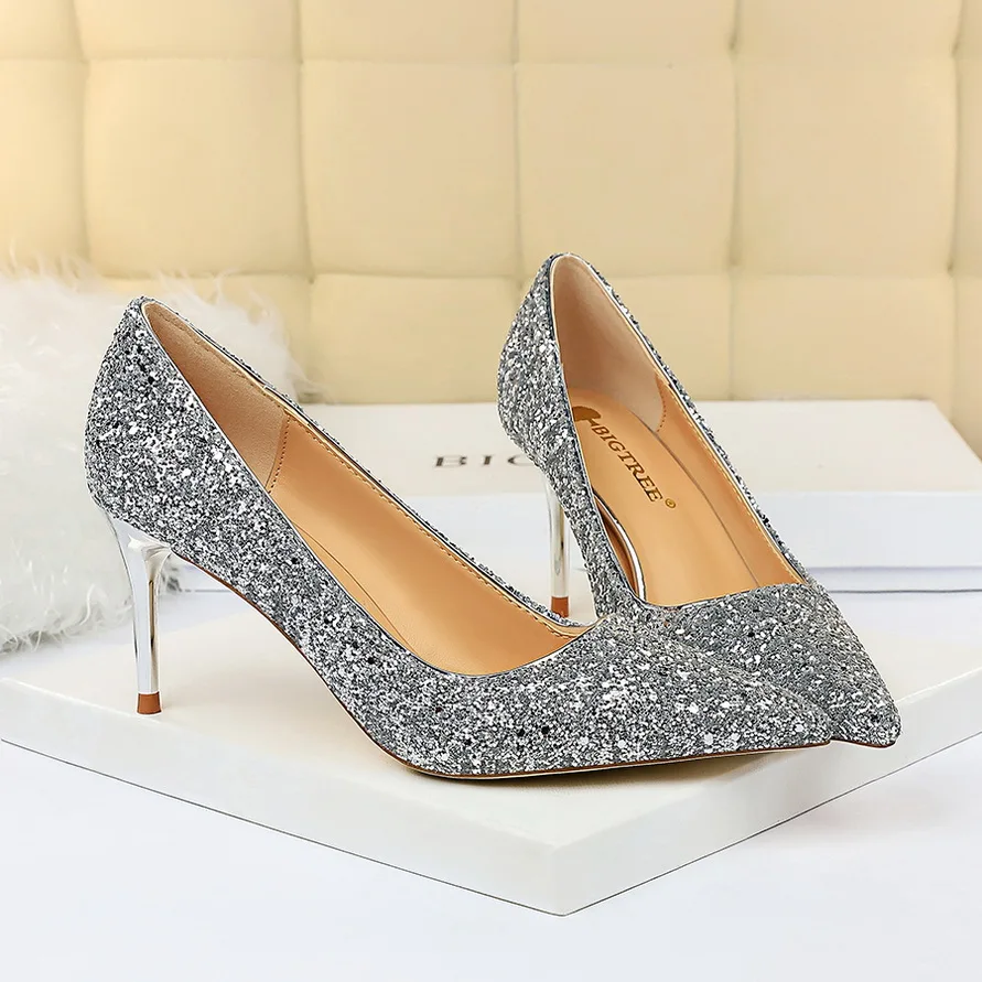 Manufacturer Women 7cm 9.5cm High Heels Pumps Wedding Bridal Scarpins Sparkly Mid Heels Lady Party Sequins Glitter Evening Gold Silver Shoes Pumps