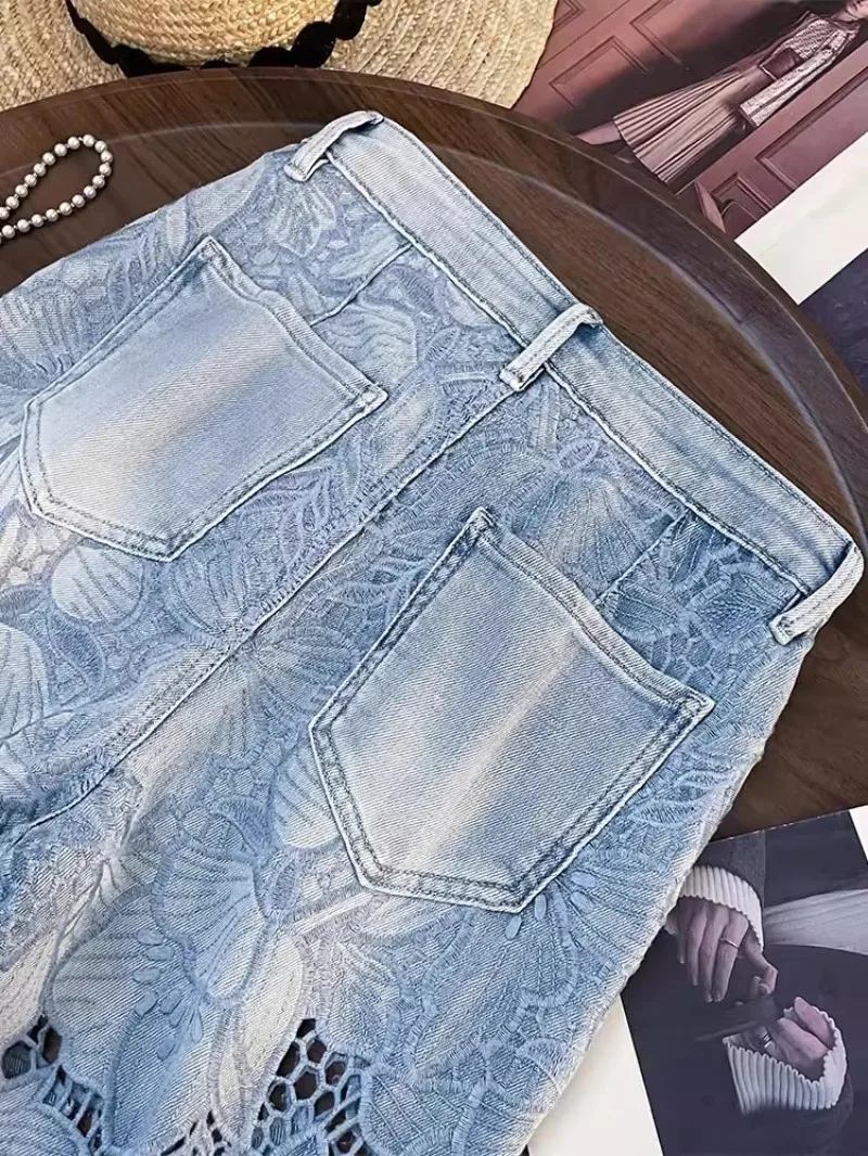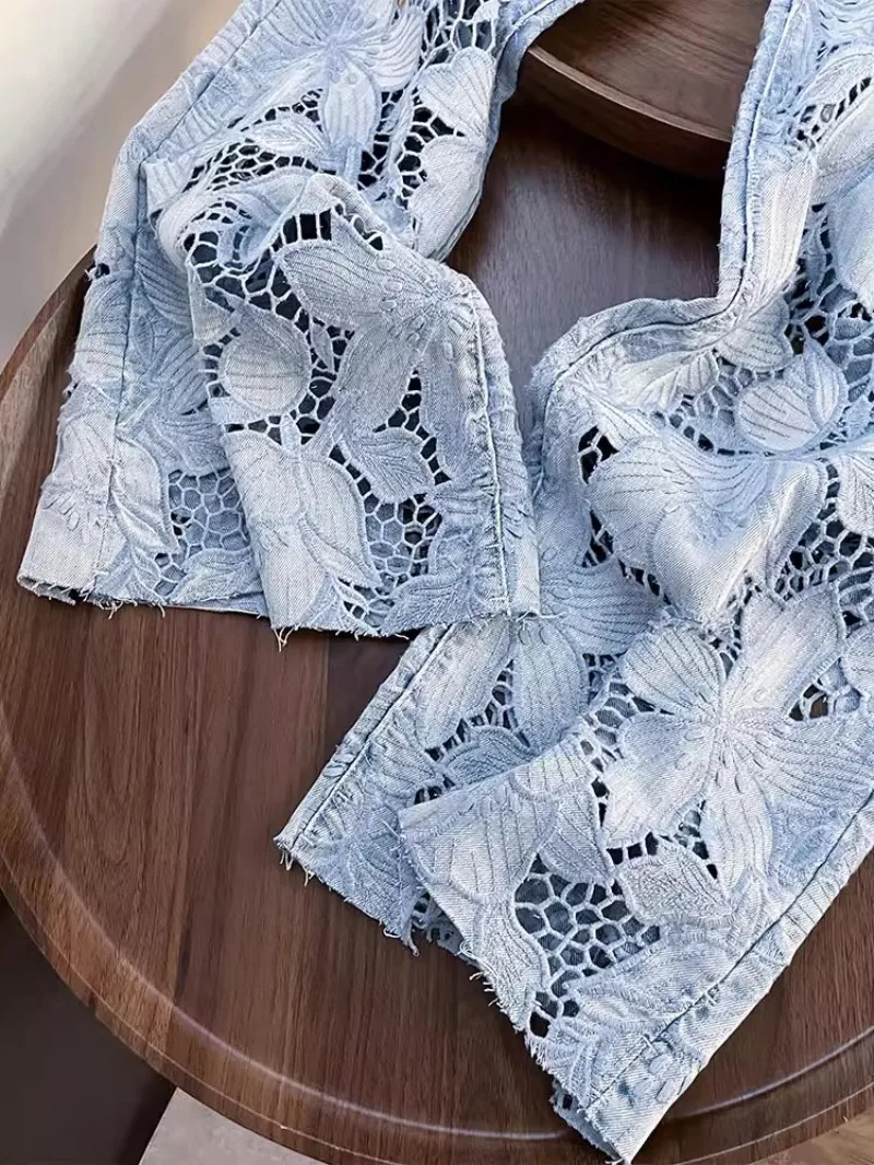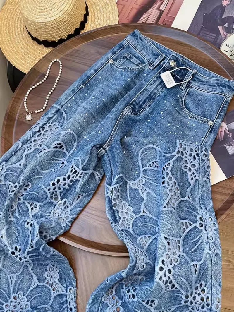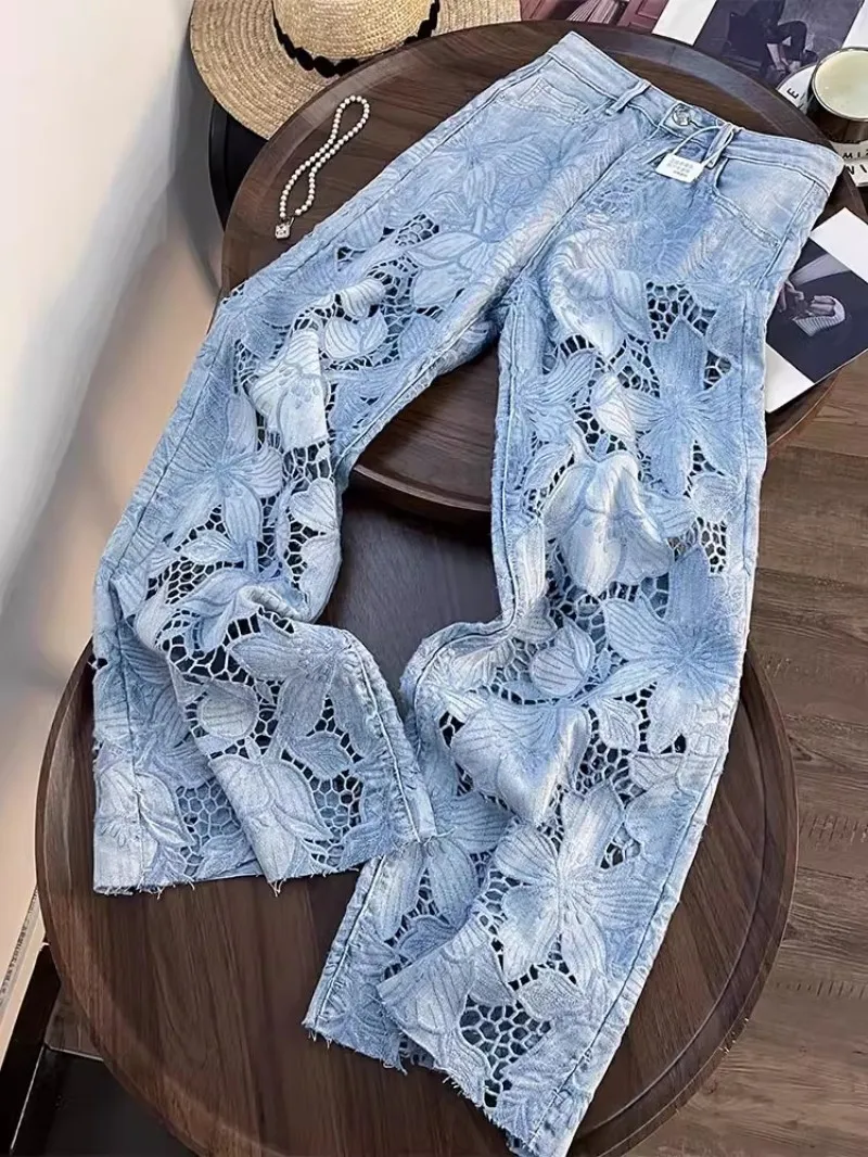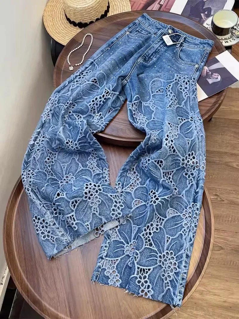 Summer Women Lace Floral Embroidery Wide Leg Denim Pant Spliced Loose Fit High Waist Hollow Out Jeans Streetwear Long Trousers