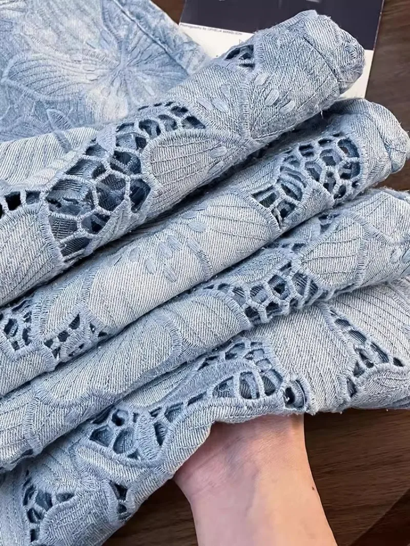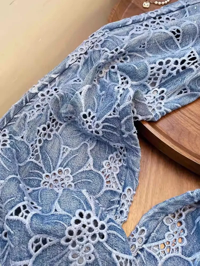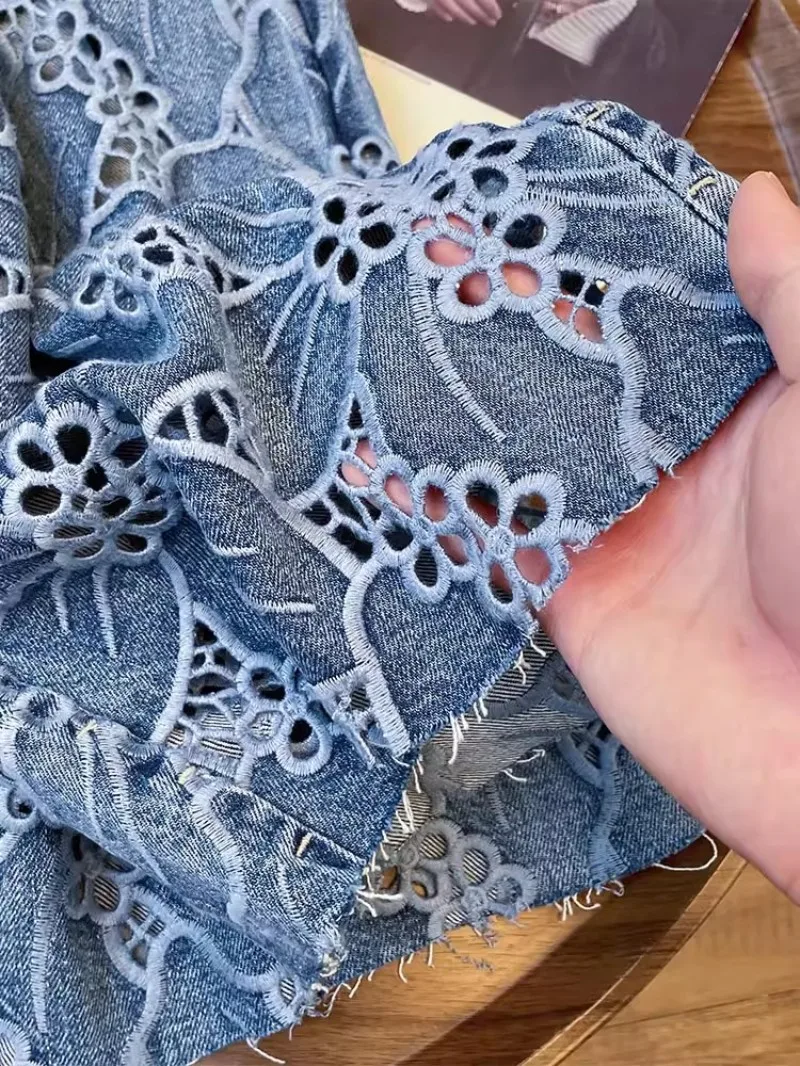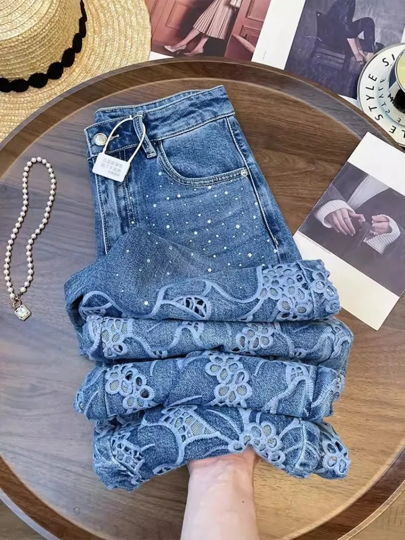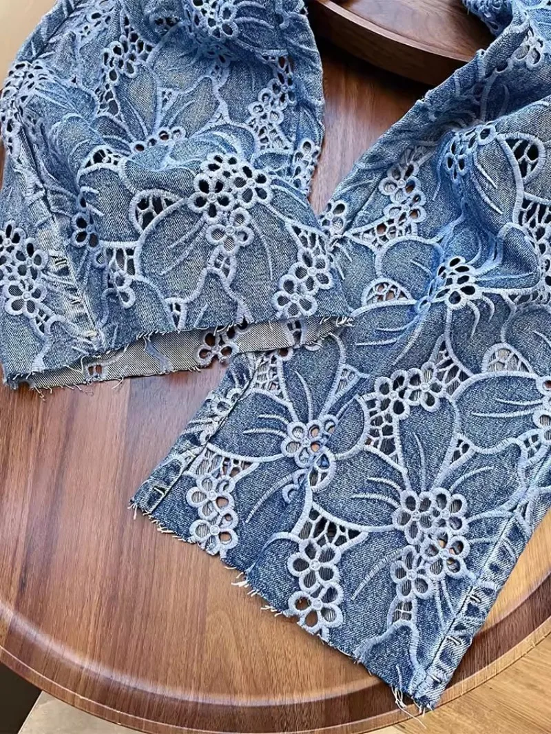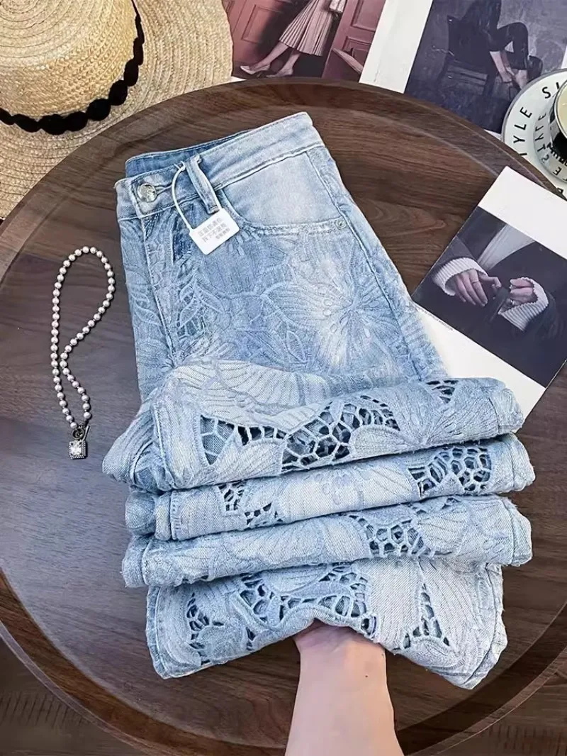 Summer Women Lace Floral Embroidery Wide Leg Denim Pant Spliced Loose Fit High Waist Hollow Out Jeans Streetwear Long Trousers