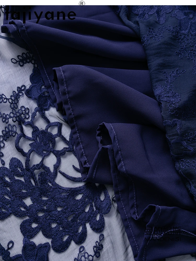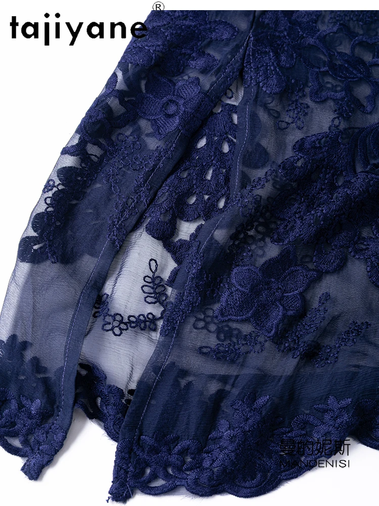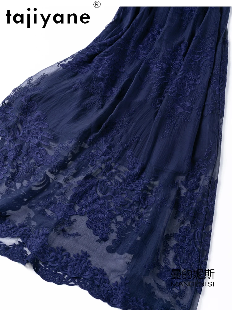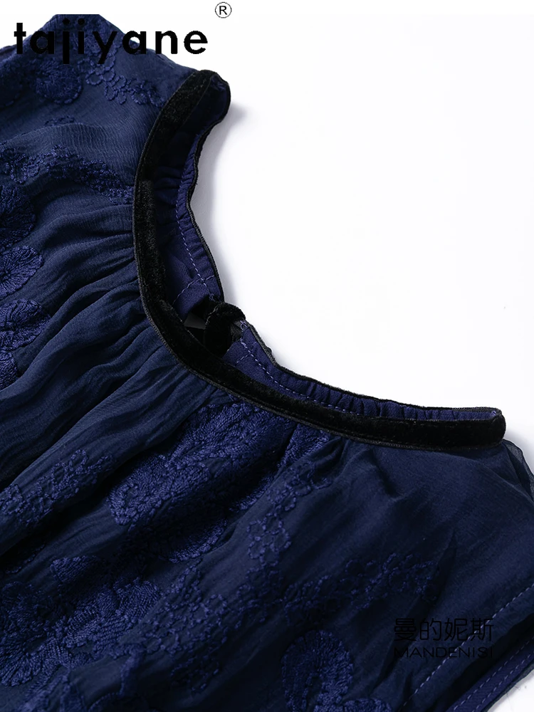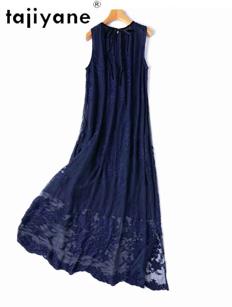 TAJIYANE 100% Mulberry Silk Dresses Woman Summer Dark Blue Embroidery Long Dress Vacation Vest Frocks Women Clothing платье