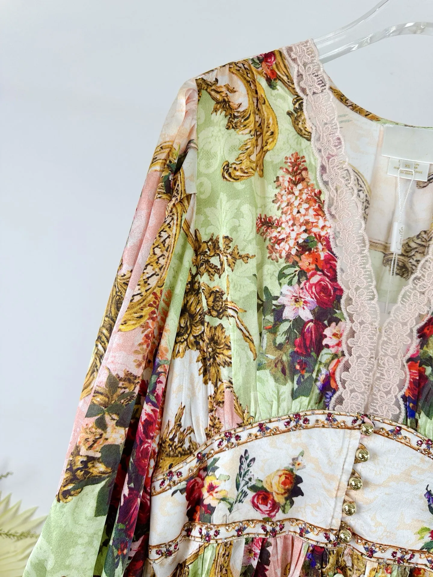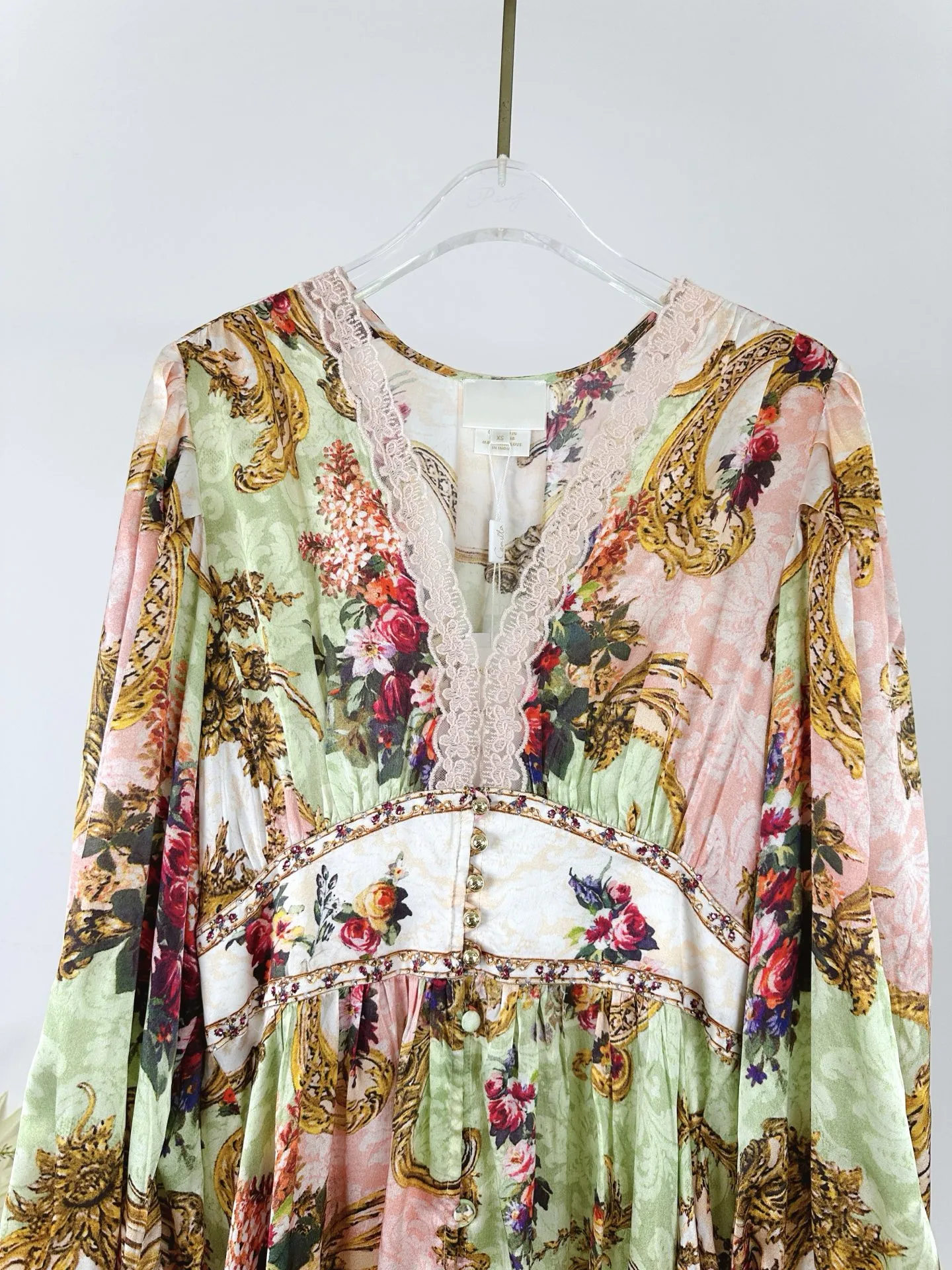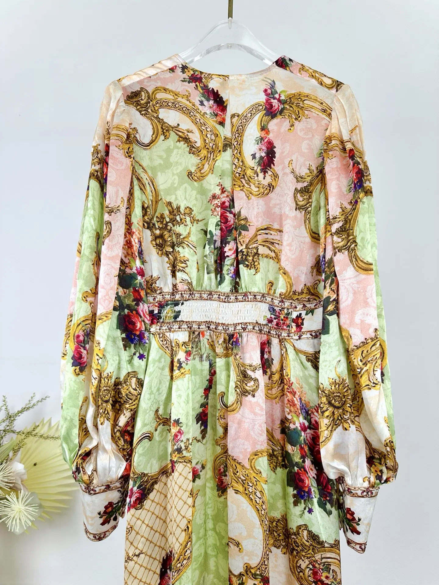 Increase quantity for Women 100% Silk Lace Patchwork Crystal Beaded Waist Digital Retro Print V-Neck Long Sleeve Maxi Dress
