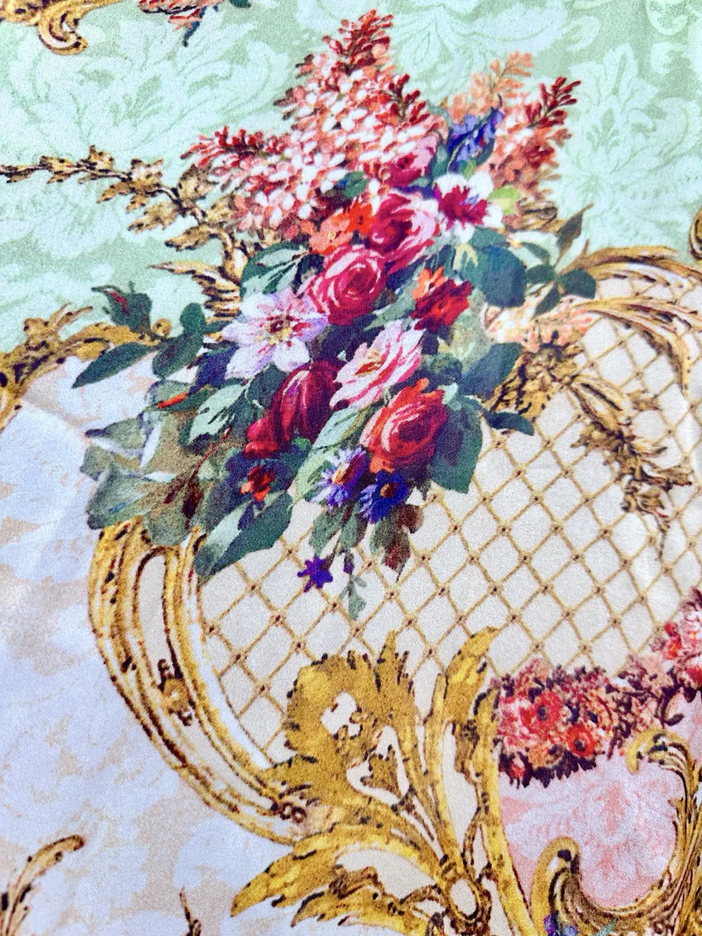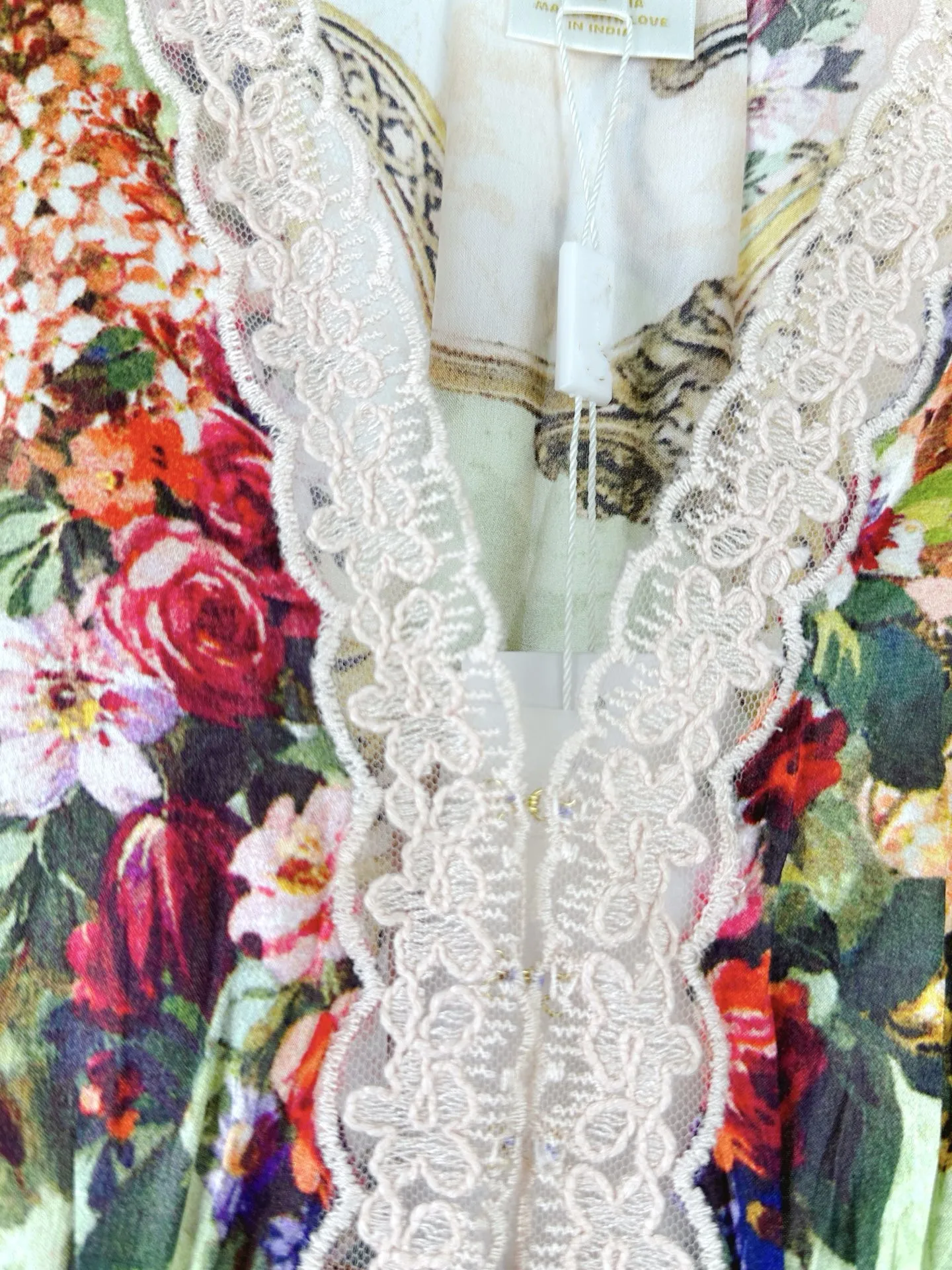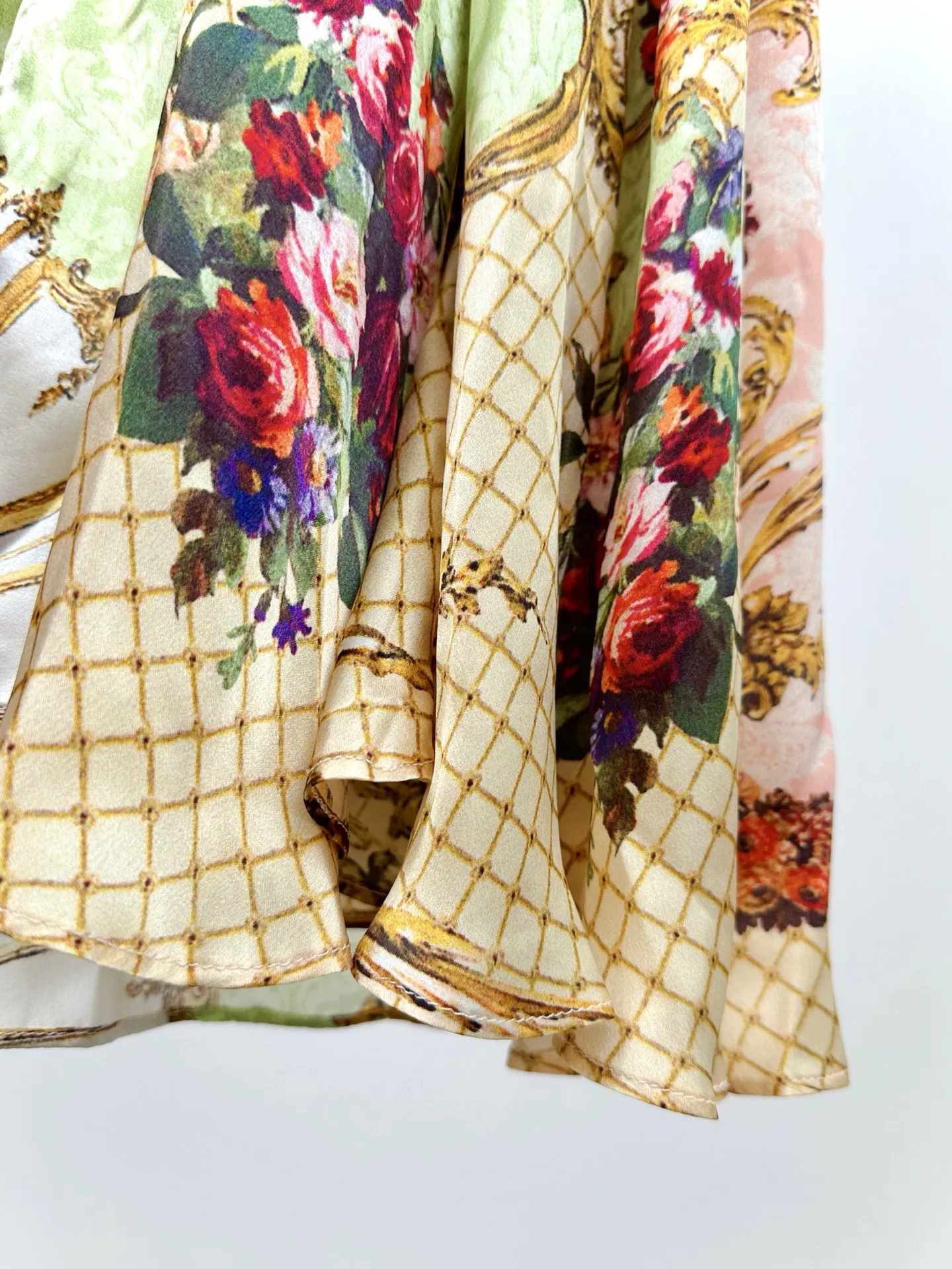 Increase quantity for Women 100% Silk Lace Patchwork Crystal Beaded Waist Digital Retro Print V-Neck Long Sleeve Maxi Dress