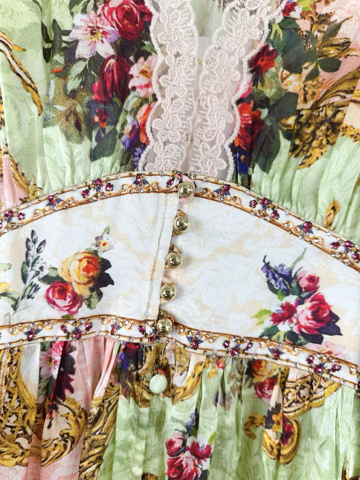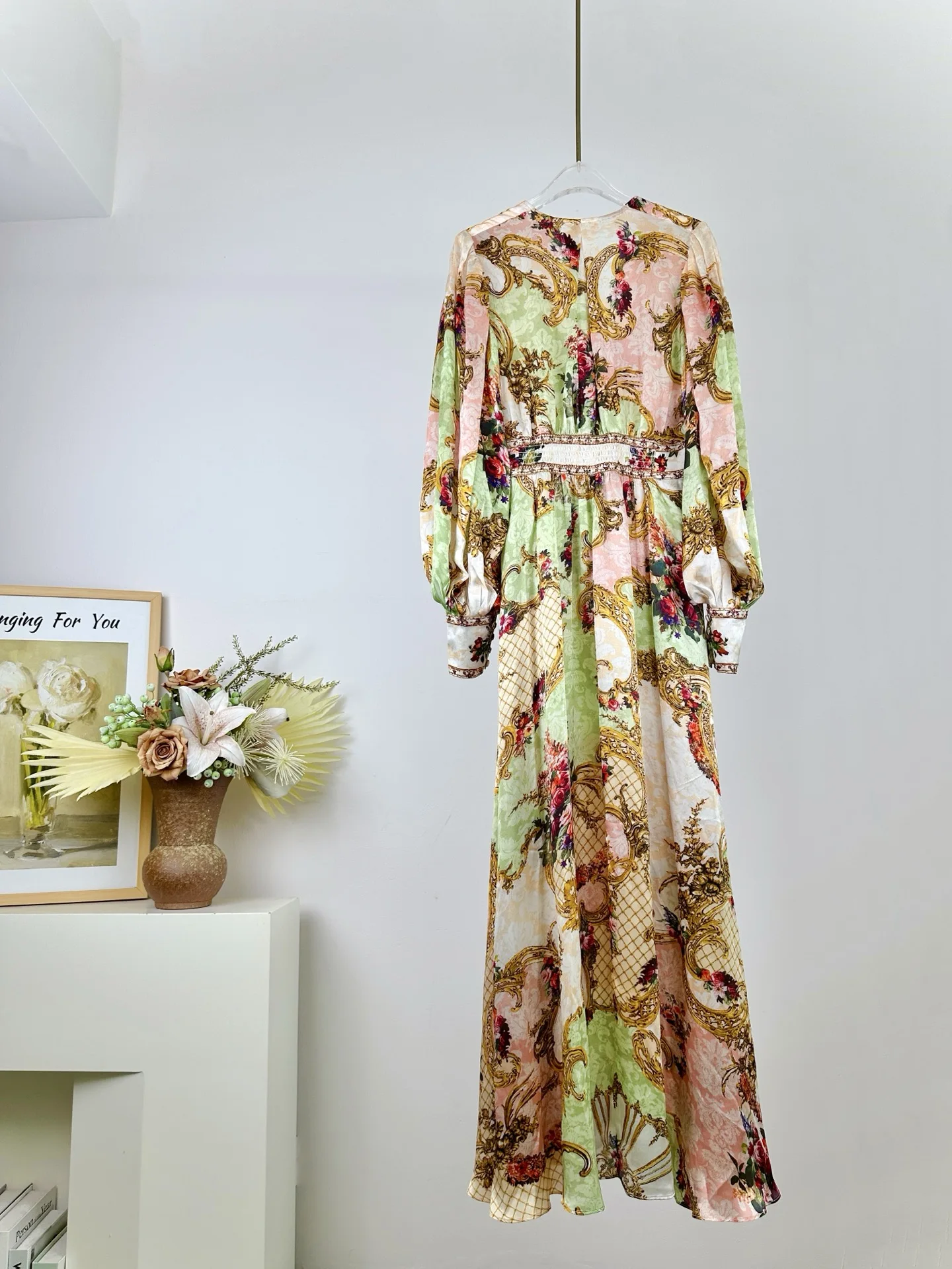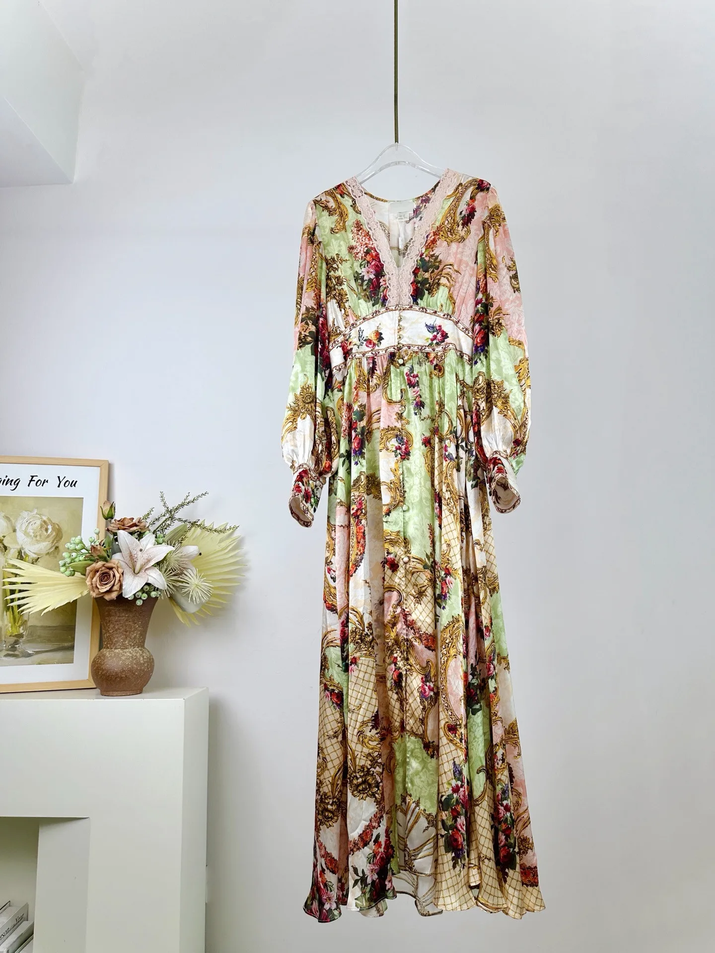 Women 100% Silk Lace Patchwork Crystal Beaded Waist Digital Retro Print V-Neck Long Sleeve Maxi Dress