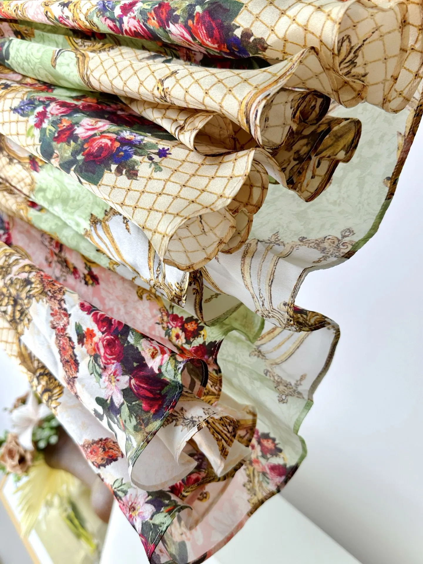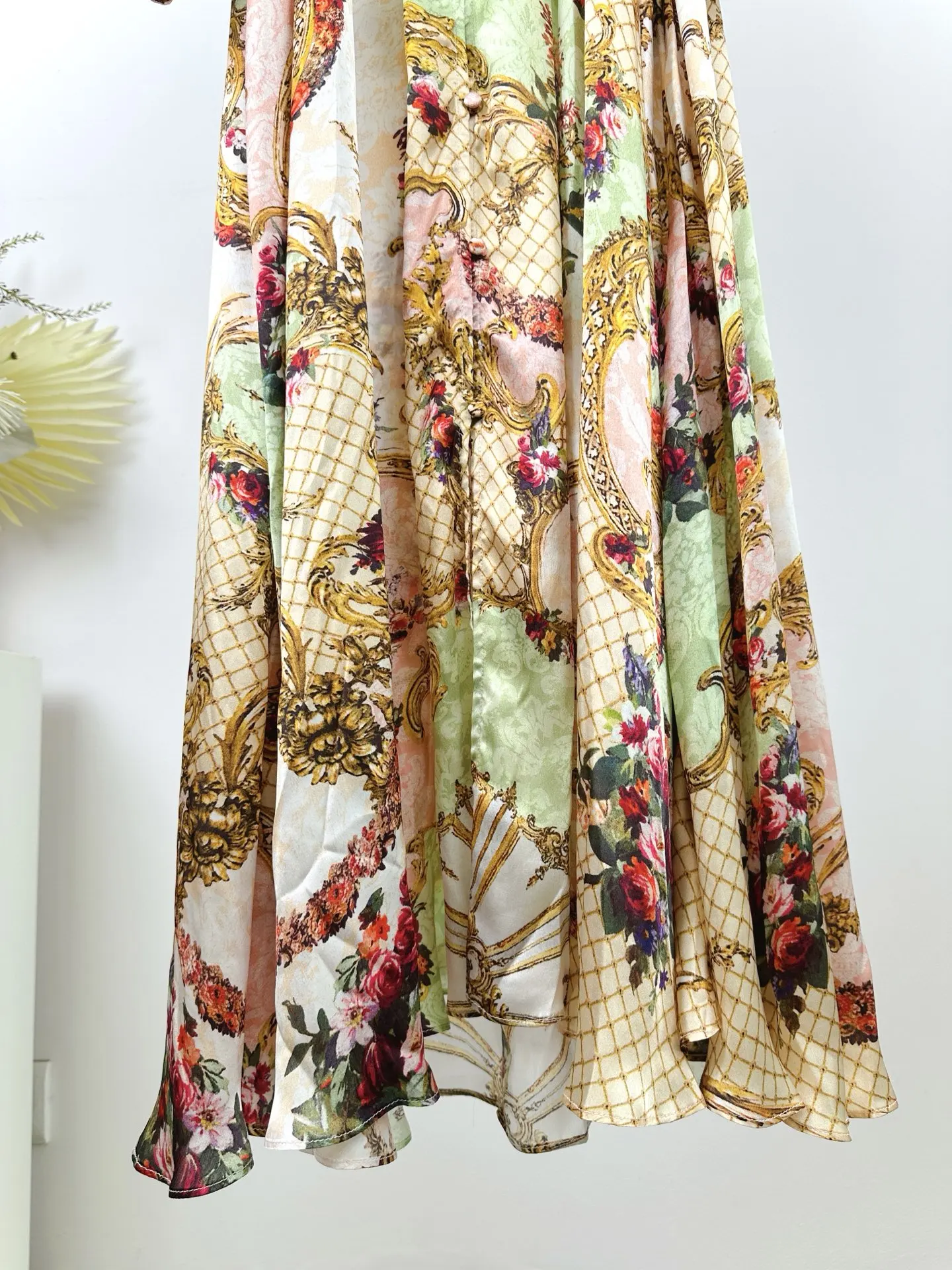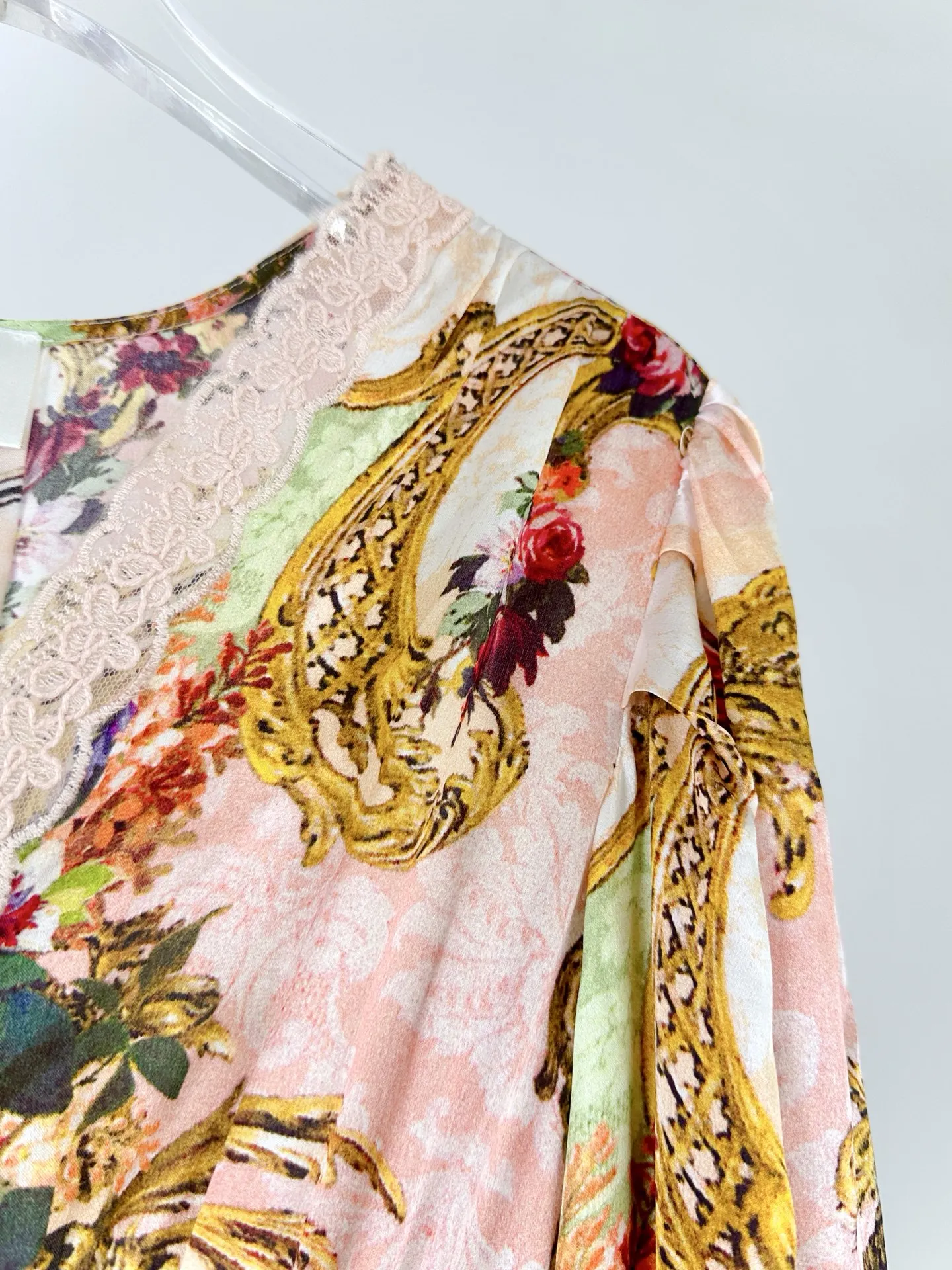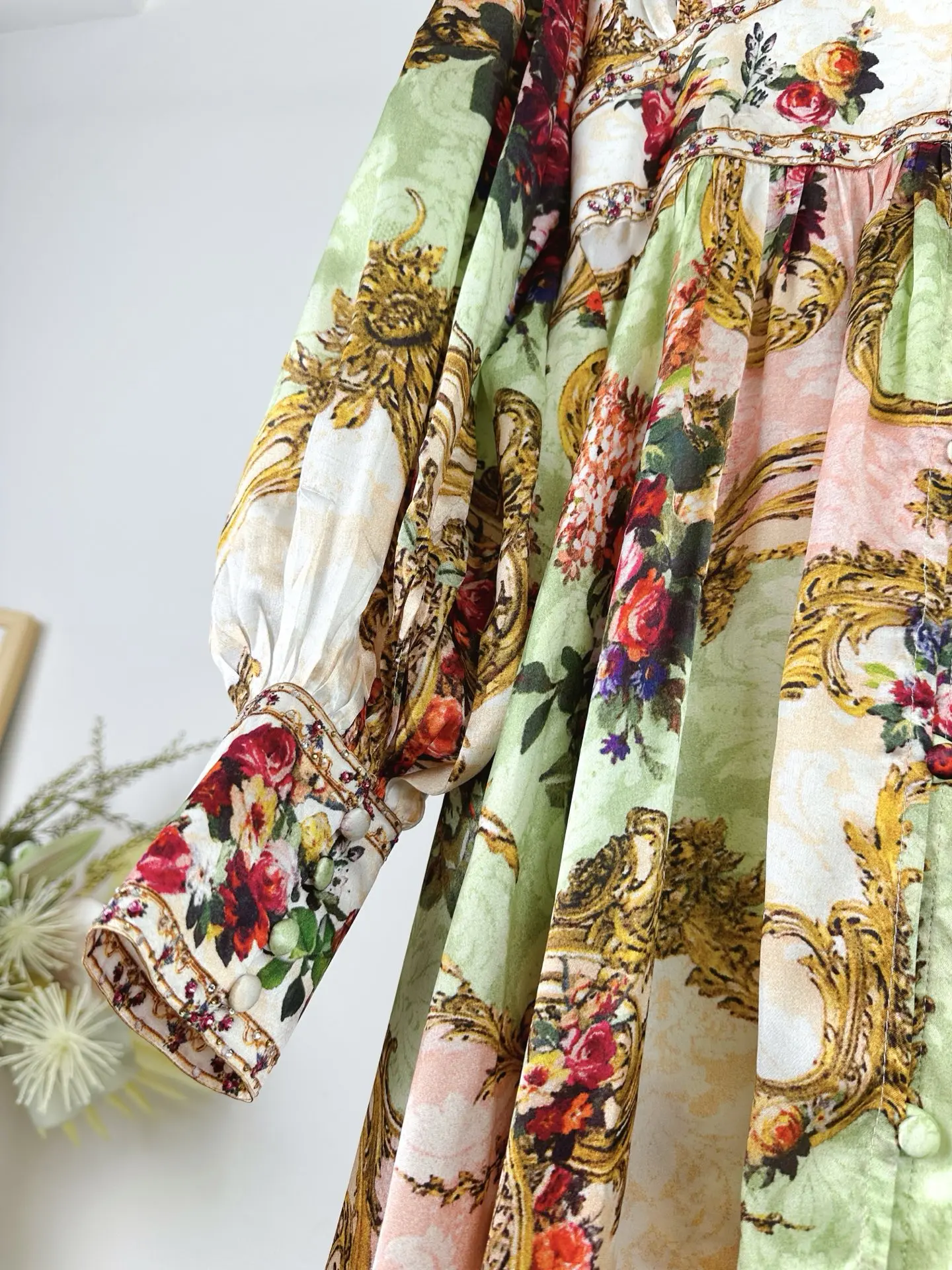 Women 100% Silk Lace Patchwork Crystal Beaded Waist Digital Retro Print V-Neck Long Sleeve Maxi Dress