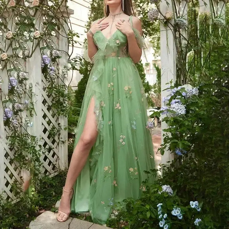 Women's Lace Embroider Flowers Pom Dress Ruffles Spaghetti Strap Backless Wedding Guest Formal Gowns Long Split Party Dresses